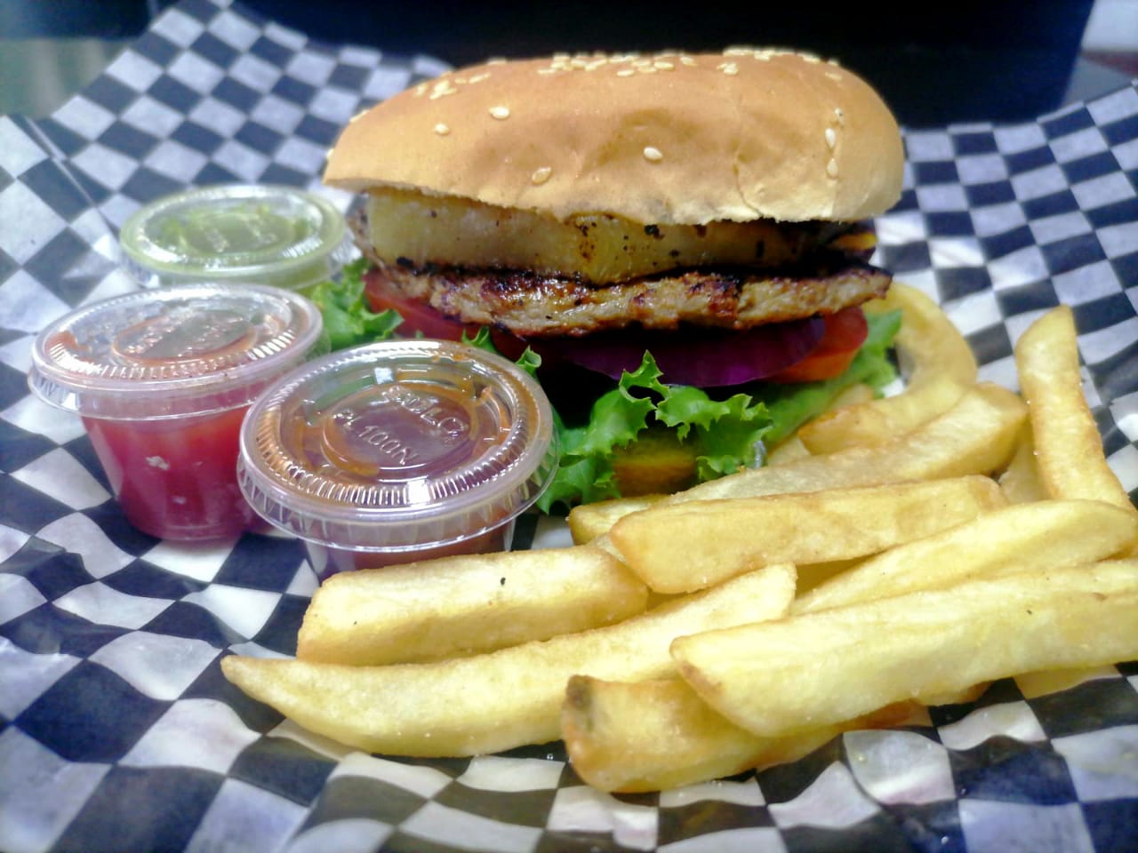 Deliciosa Hamburguesa preparada con la carne de la casa, lechuga fresca, pepinillos, jitomate, cebolla morada, piña, aderezo teriyaki