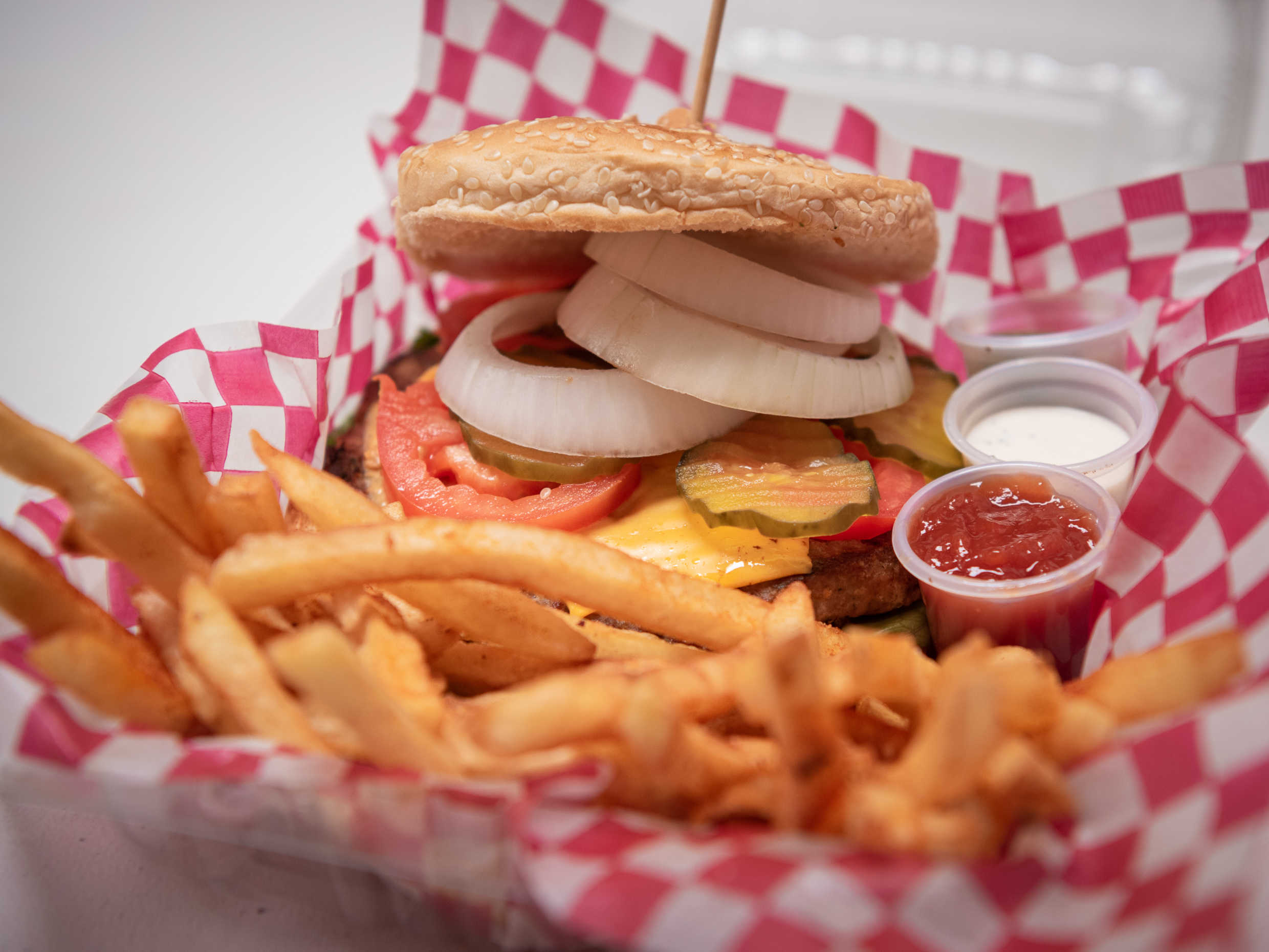 Deliciosa carne de hamburguesa, elaborada con la receta casera, una rodaja de queso americano, jitomate, lechuga fresca y aros de cebolla fritos.