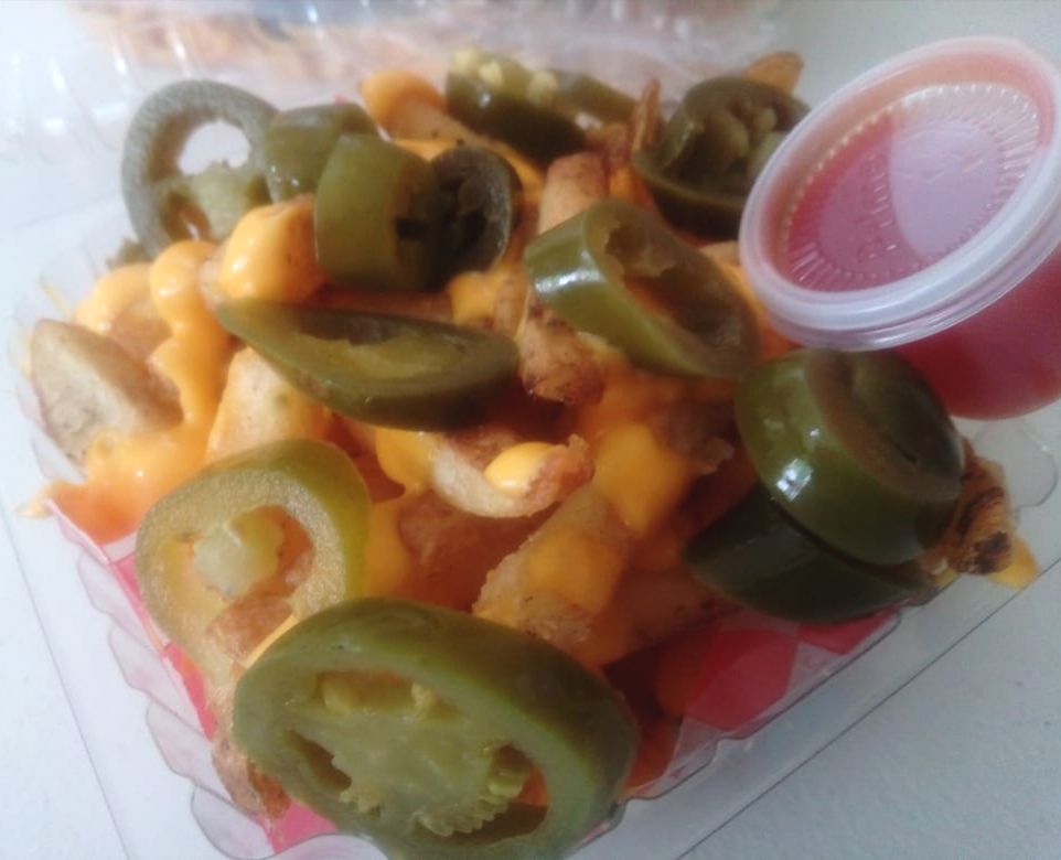 Deliciosas papas a la francesa, cubiertas con queso derritido de Nacho y rodajas de deliciosos Jalapeños.