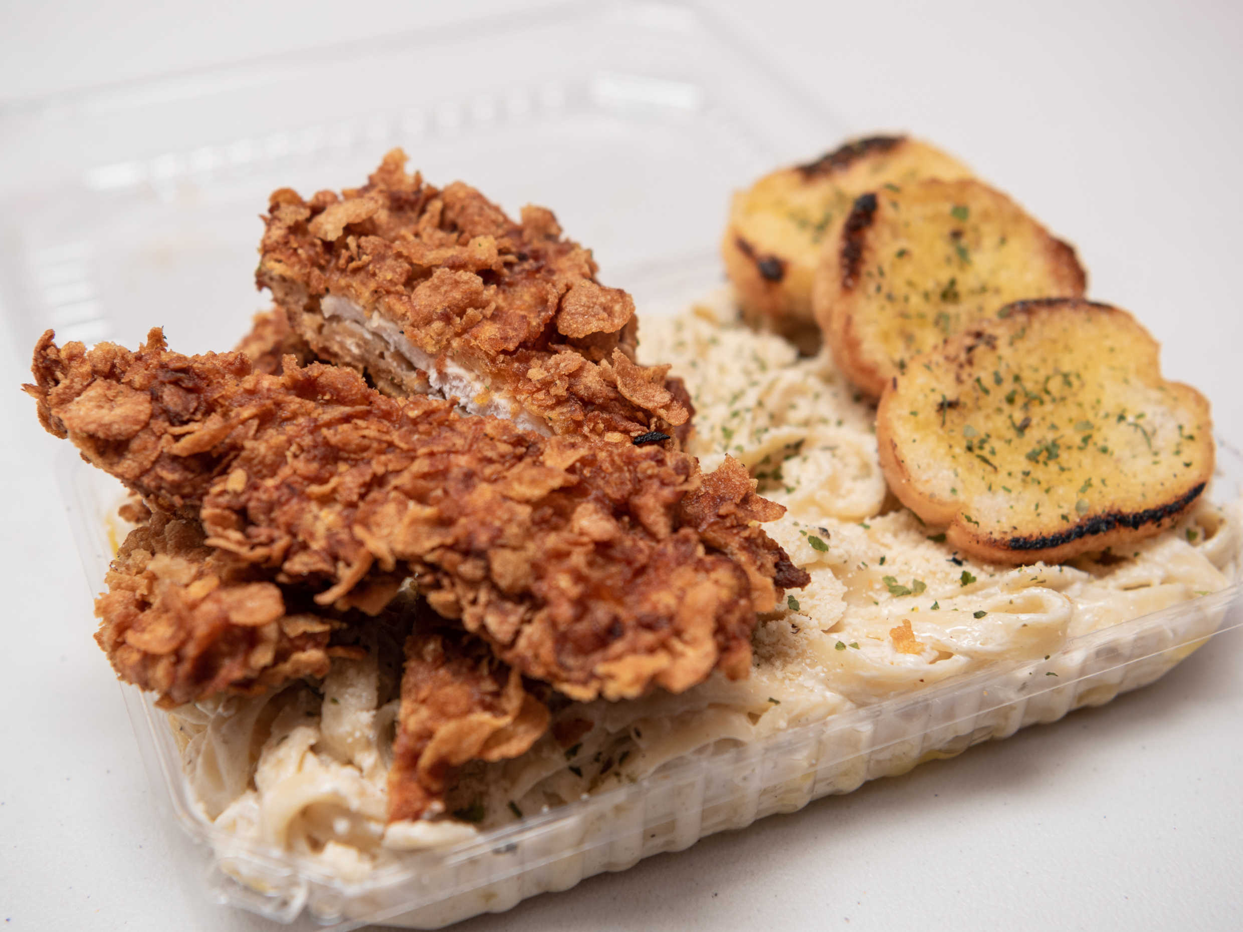 Abundante Pasta Con la Crema de tu elección, acompañado con deliciosas tiras Crispy ideal para compartir en Familia