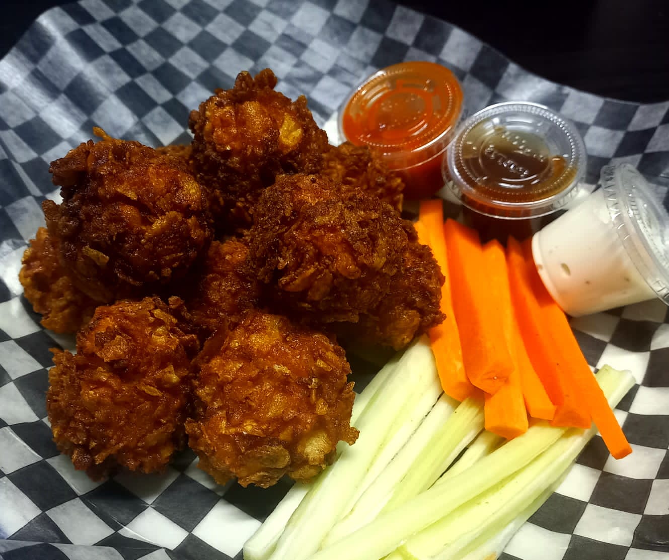 Trocitos de pollo empanizados, acompañados de la salsa de tu elección con Apio y zanahoria con aderezo ranch