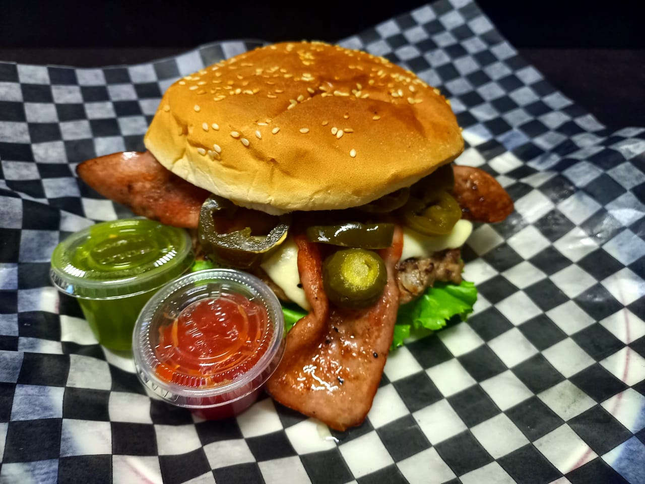 Deliciosa carne de hamburguesa, elaborada con la receta casera, una rodaja de queso americano pimiento, tiras de tocino, jitomate, lechuga fresca y cebolla blanca, acompañado con rodajas de jalapeño.