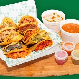 Paquete de 10 gorditas, guarnición de frijol, arroz y salsas.