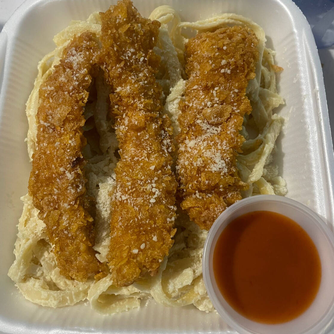 Pasta Alfredo acompañada de 3 tiras crispy.