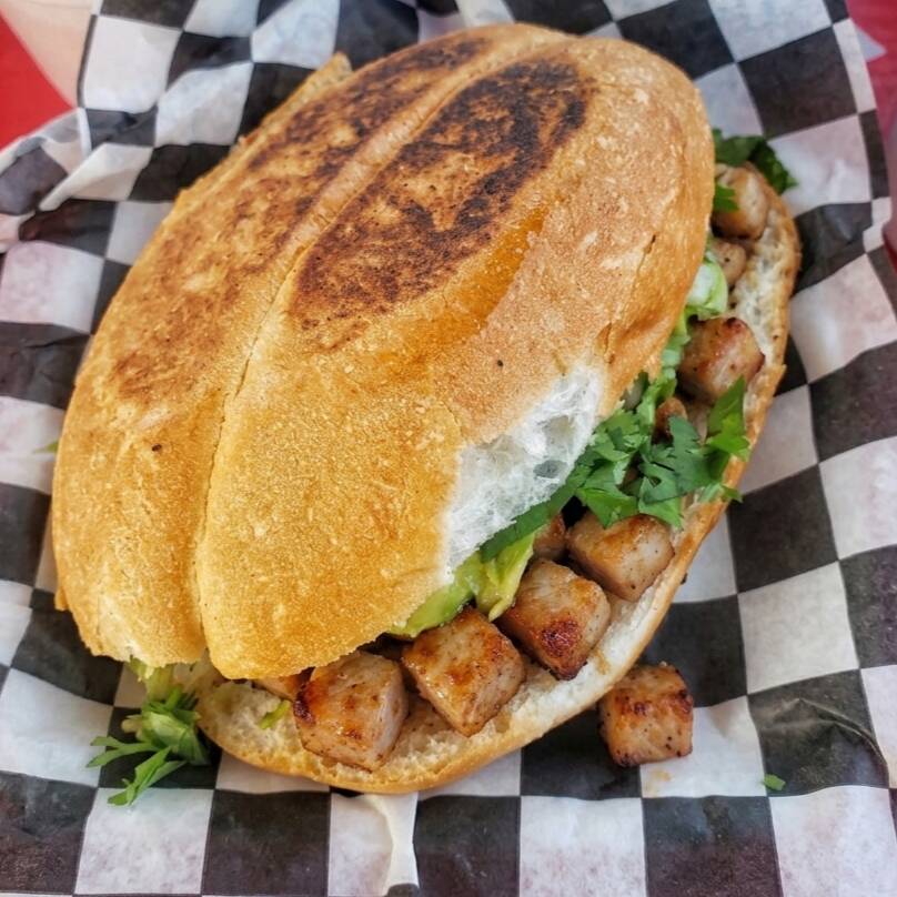 120 gr de picaña ahumada, bolillo yucateco con aderezo, cebolla asada y guacamole, acompañado de alioli y salsas aparte.