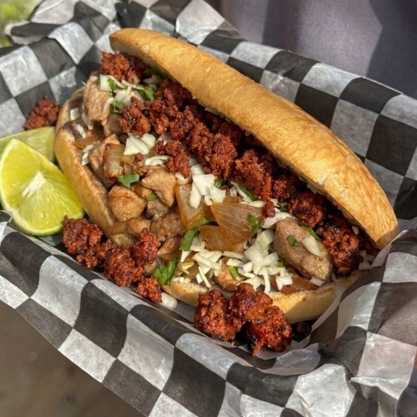 Bolillo yucateco, frijoles refritos con 100gr de carne marinada en naranja agria, cebolla asada y longaniza ahumada de valladolid. salsas por separado.