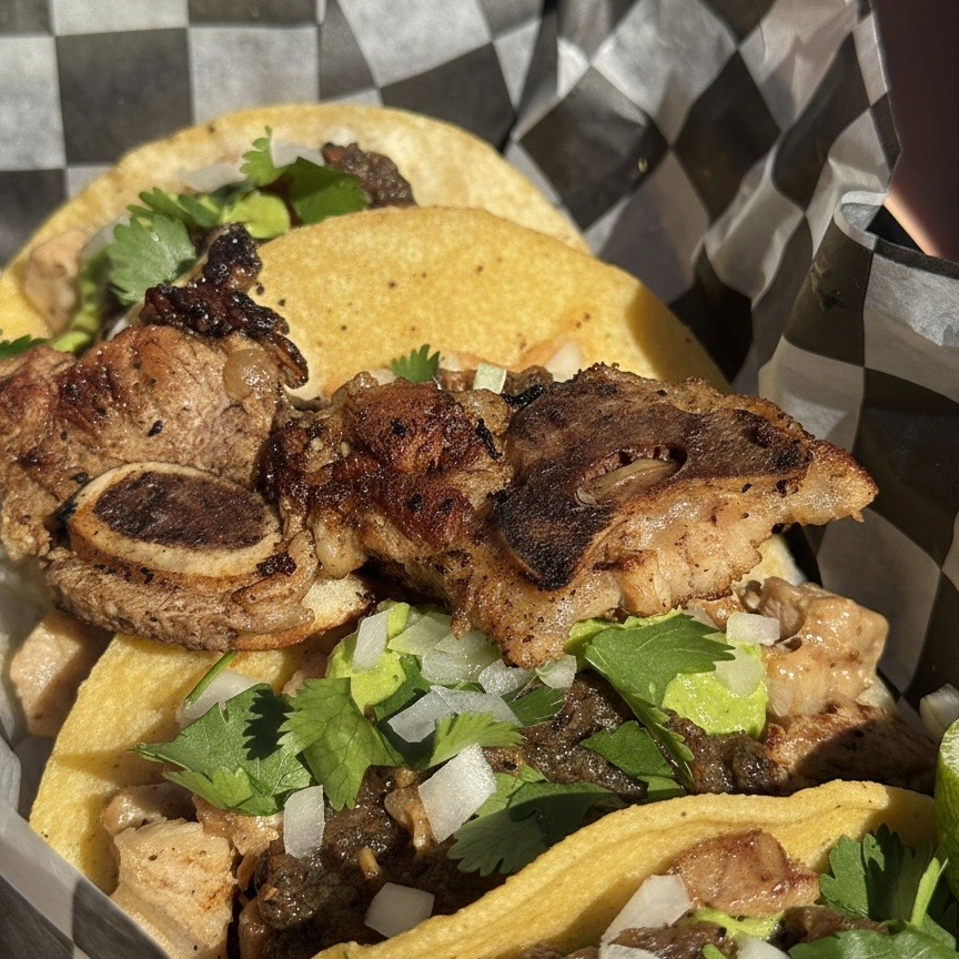 Orden de 4 tacos de asada, con pico de repollo, cebolla asada y salsas aparte.