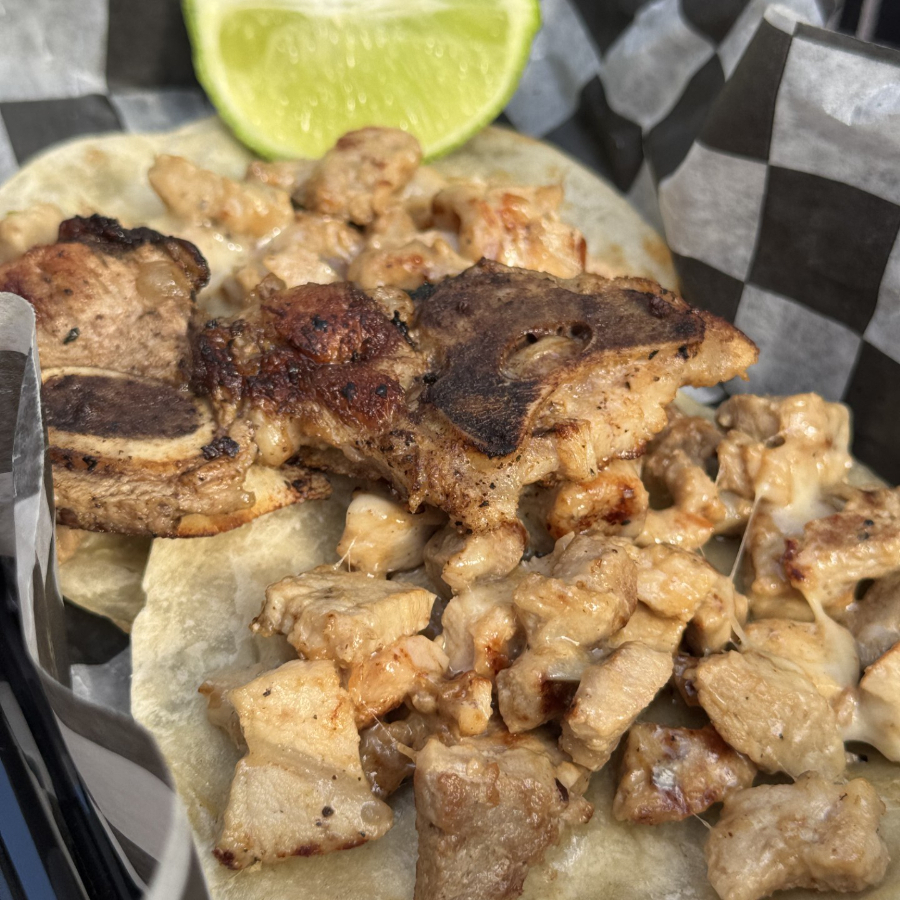 Taco de chuleta con queso de harina con copia, con salsa de tomate picante y salsa de guacamole, cebolla y cilantro.