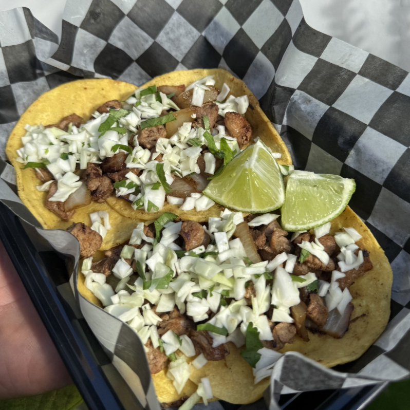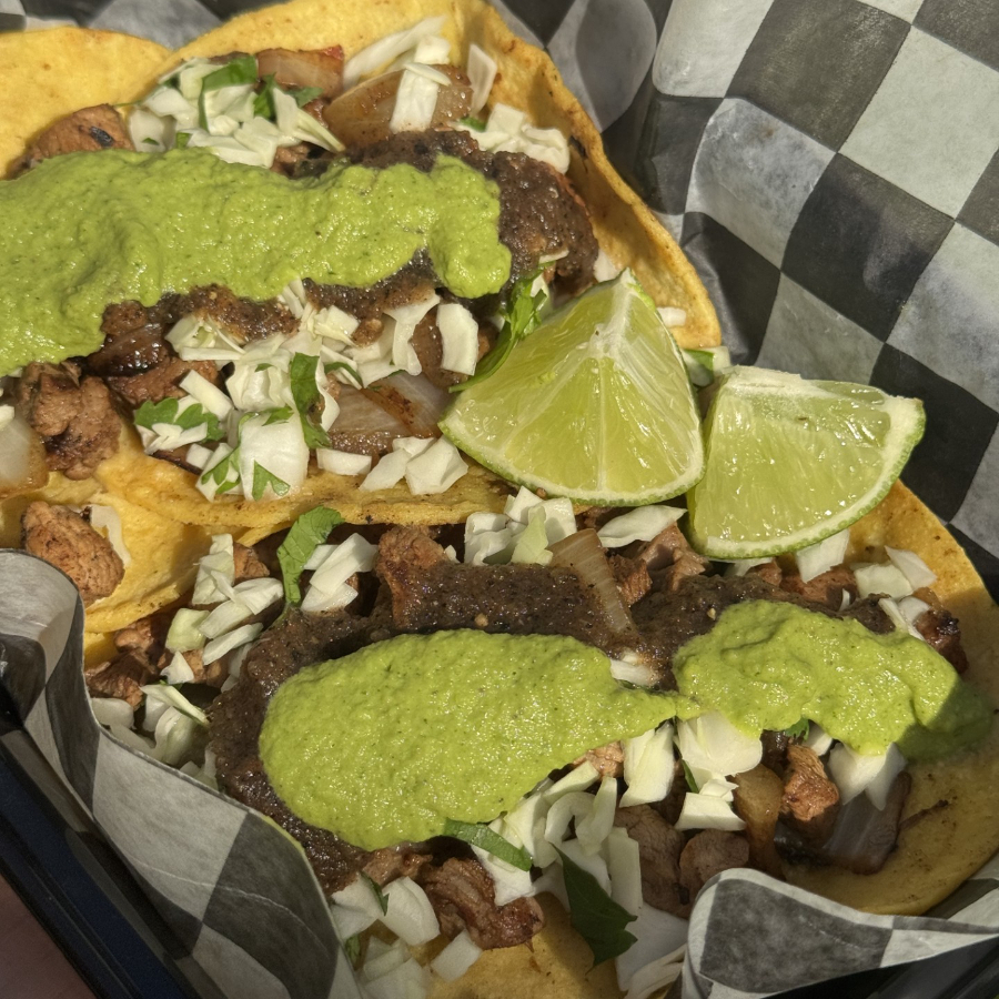 Taco con doble tortilla, 45 gr de carne asada, pico de repollo, y cebolla asada, con salsa de aguacate y salsa asada picante.