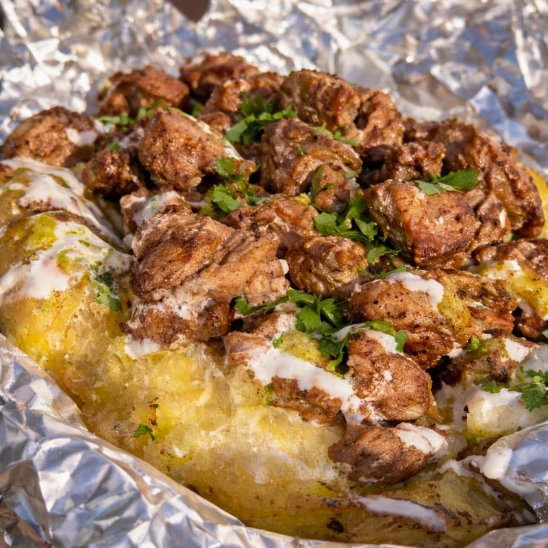 Papa asada rellena de carne asada, con queso gratinado, pico de gallo, cebolla asada, crema y salsas aparte. (incluye tortilla de maíz y de harina)