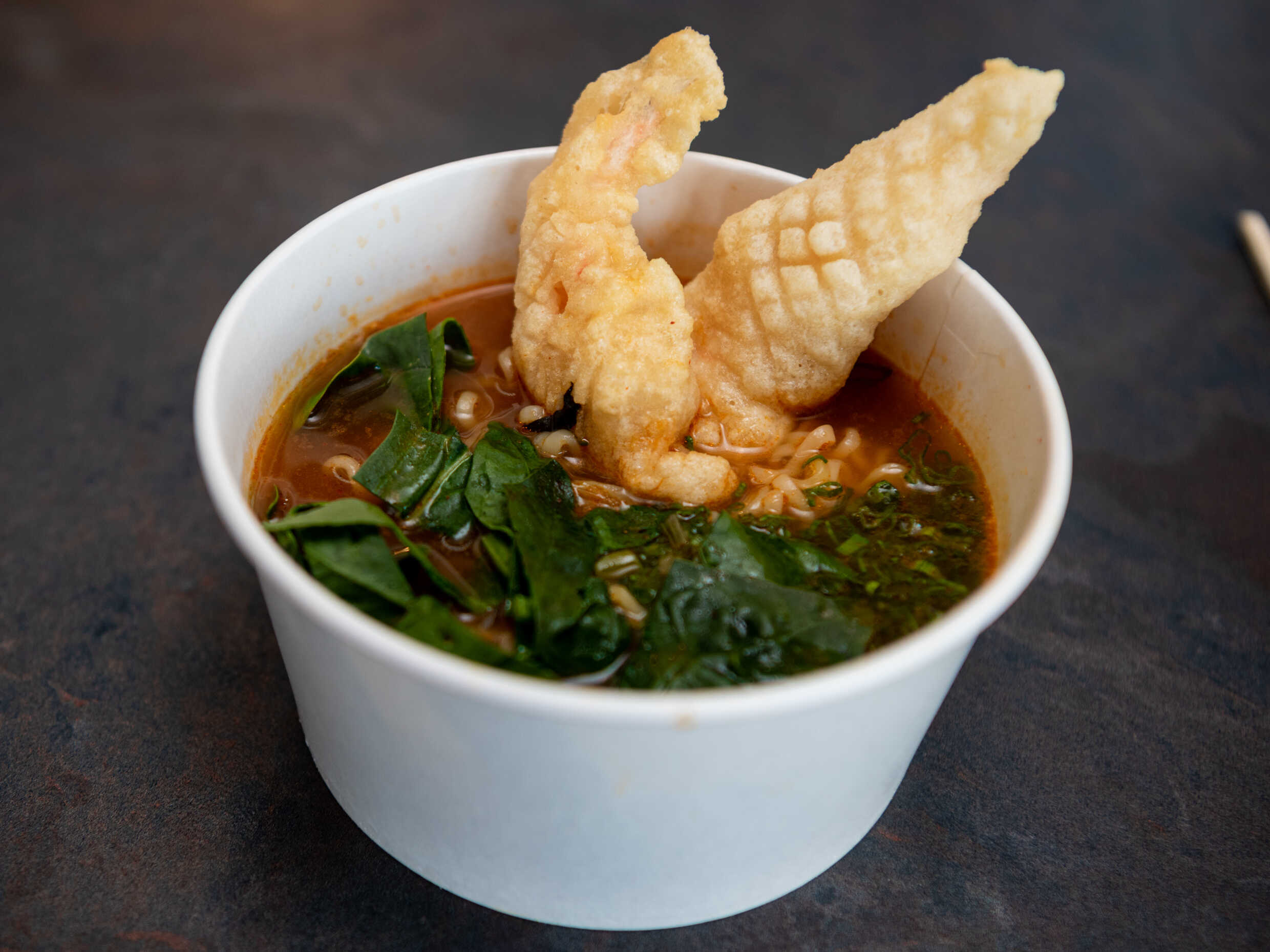 Deliciosa sopa a base de noodles, camarónes tempura y espinacas.