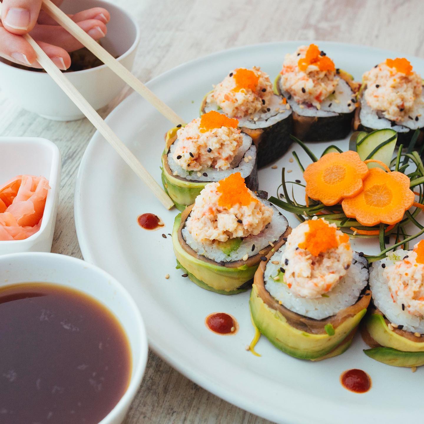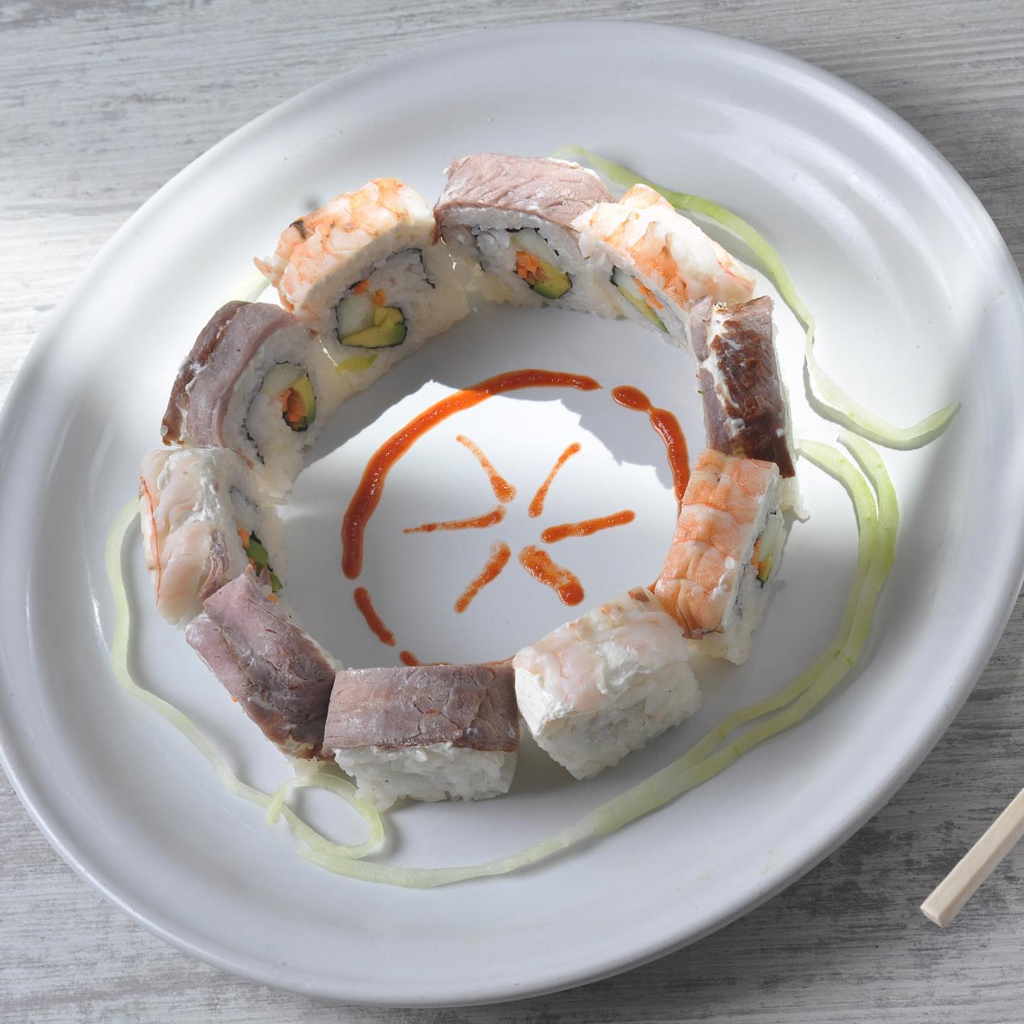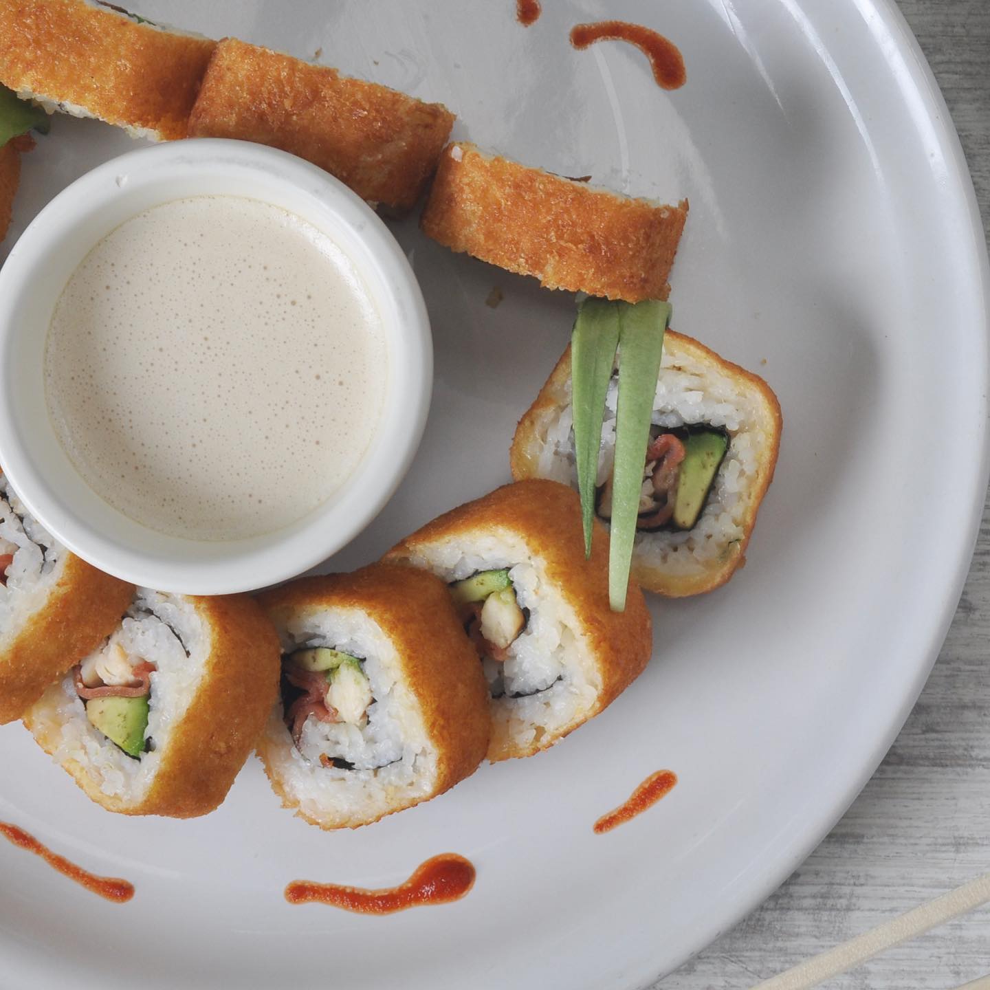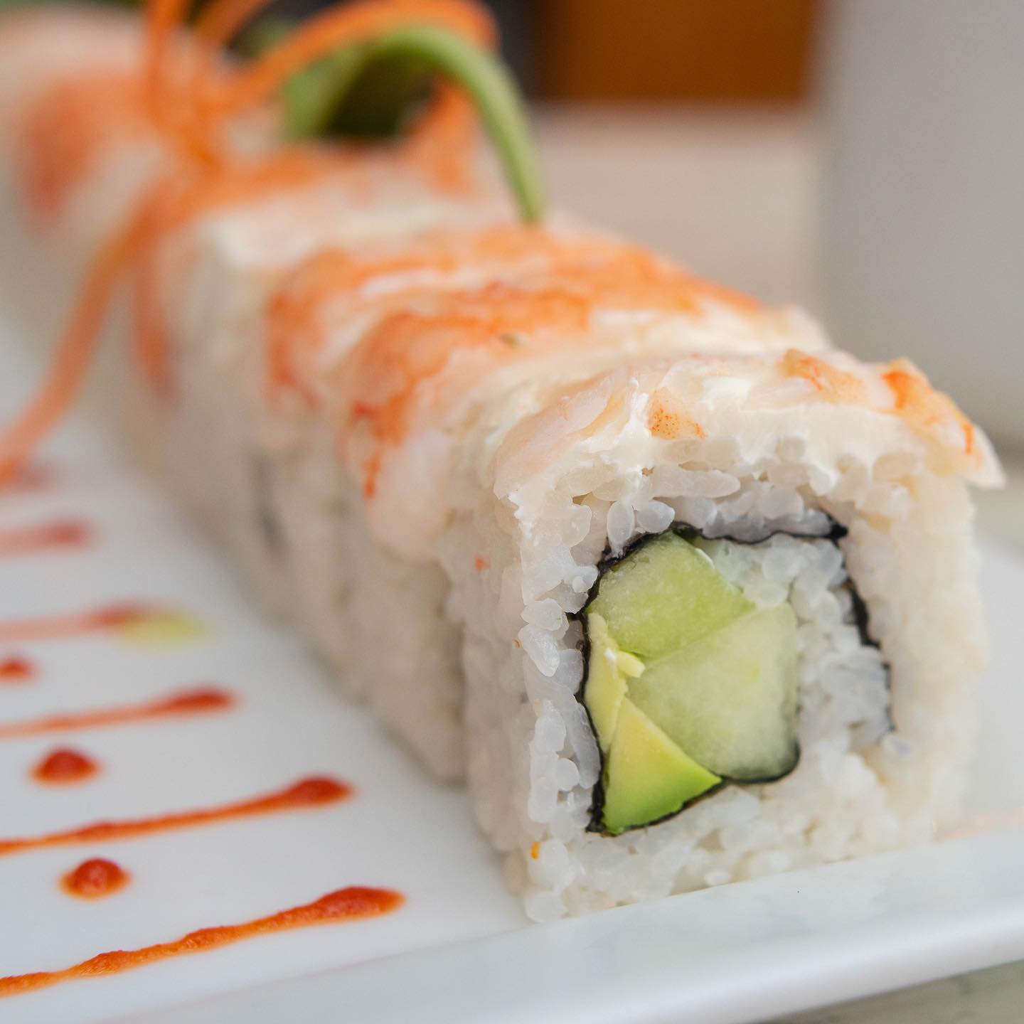 Por fuera: aguacate, tampico chipotle, camarón empanizado, siriacha y ajononjoli, por dentro: pepino y queso crema.
