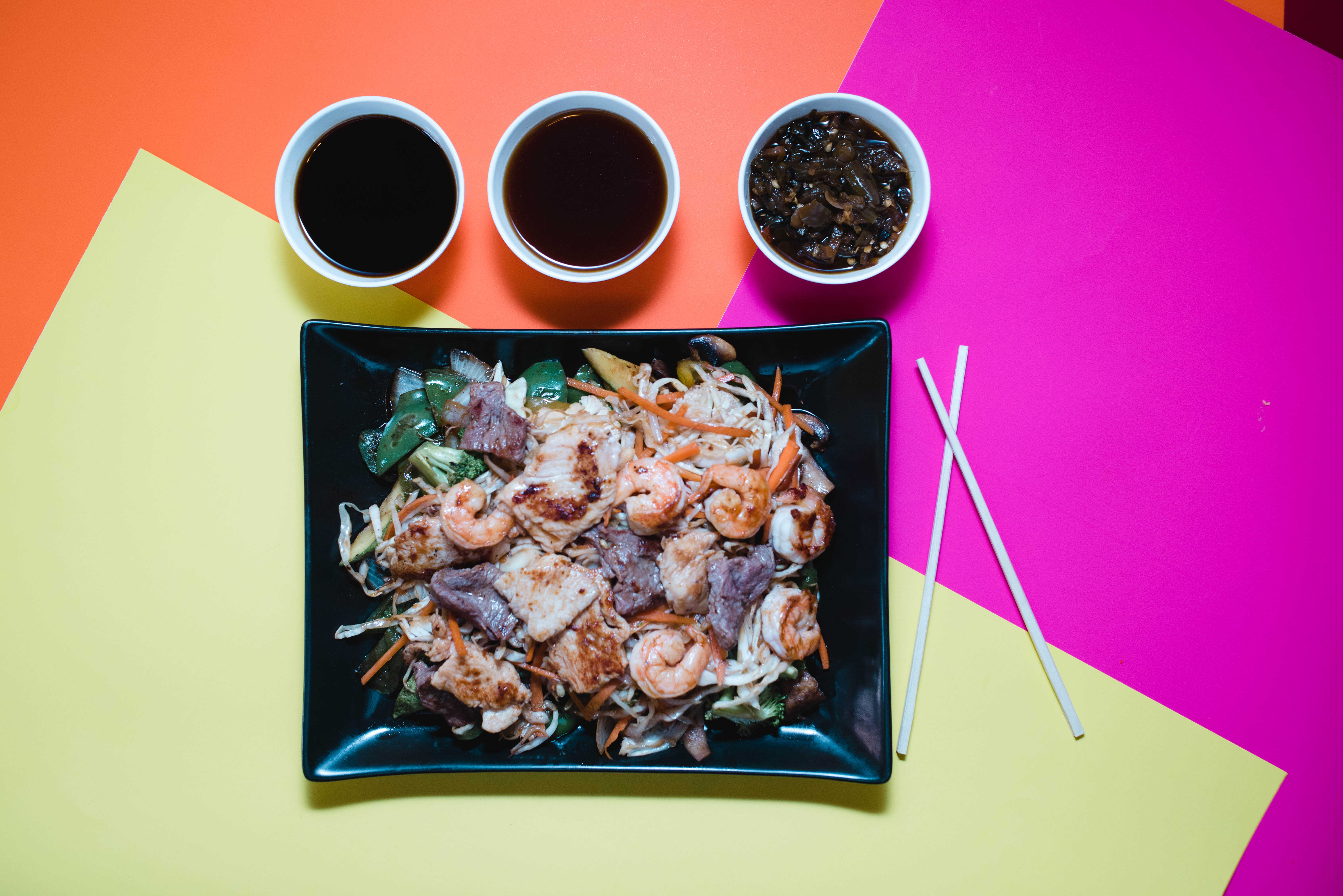 Arroz frito a la plancha sazonado con la receta de la casa, acompañado de pollo, res, camarón, aguacate y queso crema. **NO INCLUYE SALSAS**