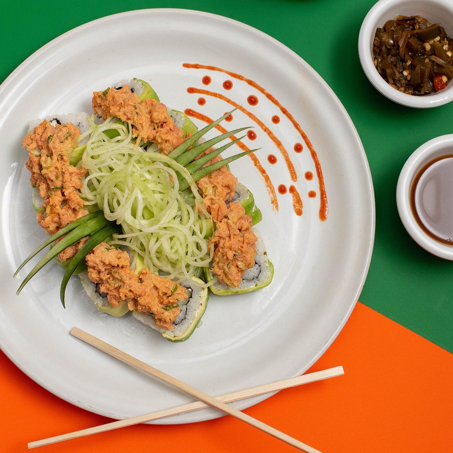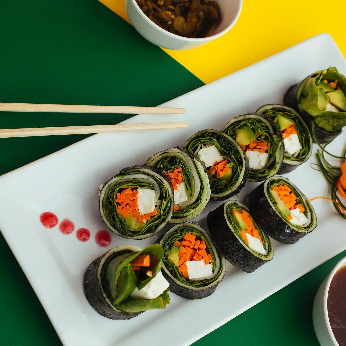 Por fuera: alga nori y lluvia de pepino con zanahoria, por dentro: zanahoria, pepino, lechuga, espinaca, aguacate, germinado de soya y tofu. **NO INCLUYE SALSAS**