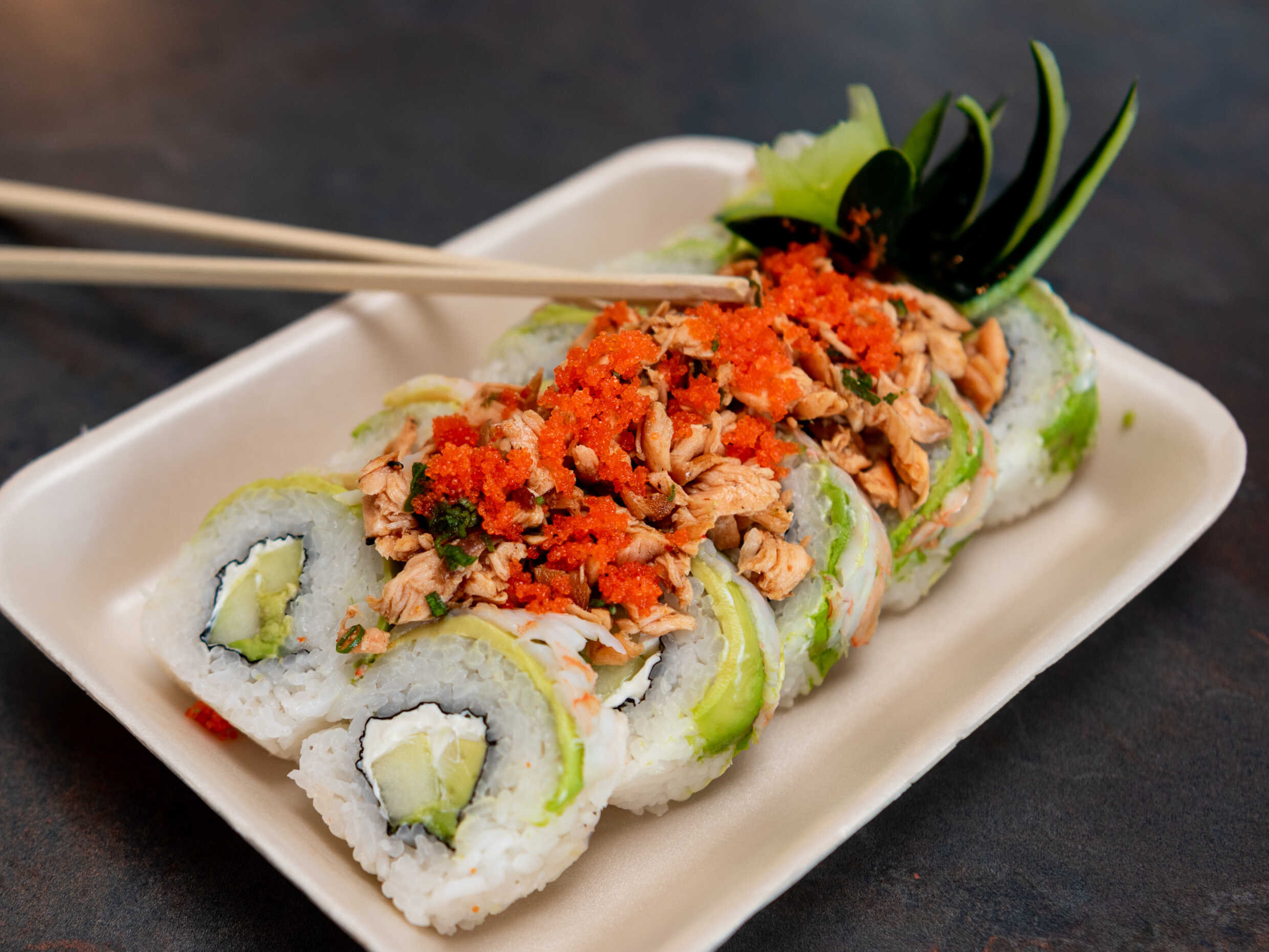Por fuera: alga nori y tempurizado, por dentro: salmón, masago, queso crema y aguacate.
