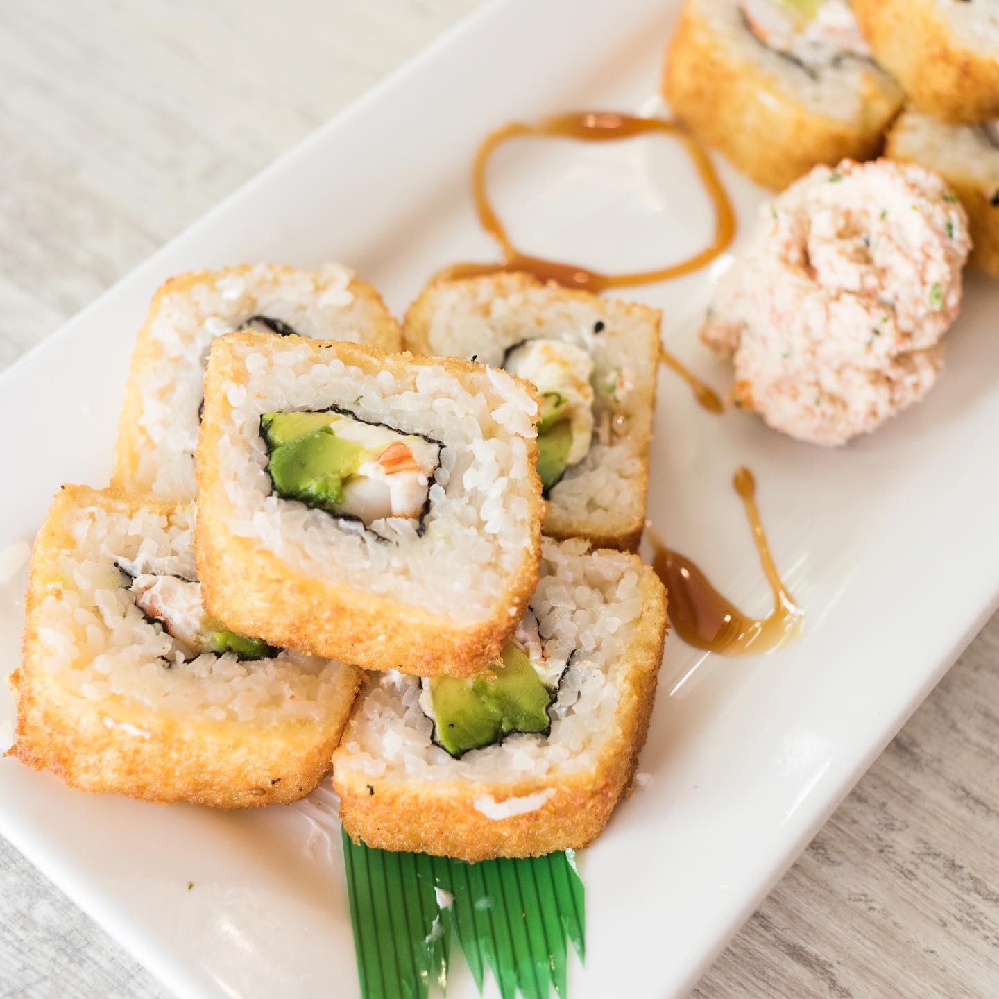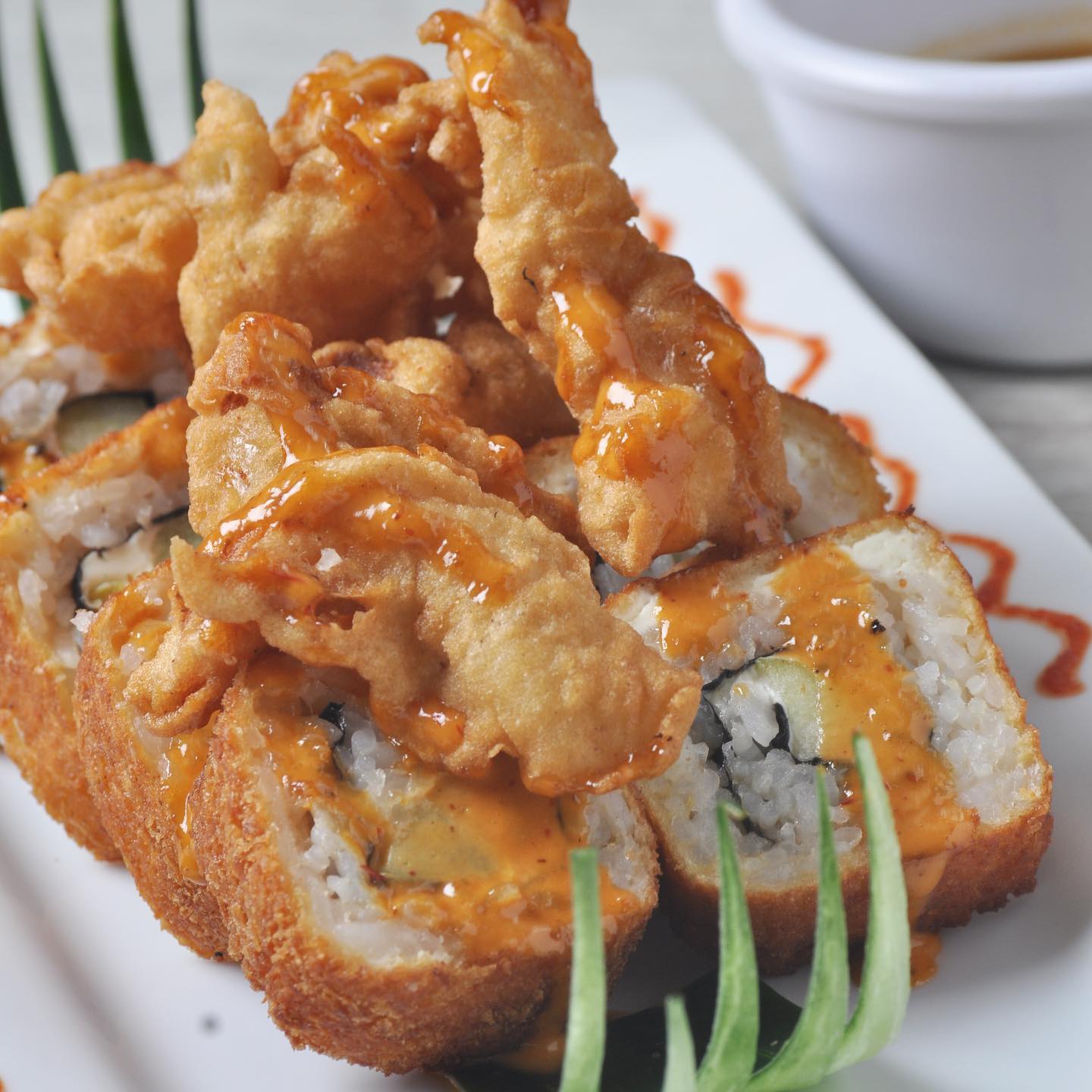 Por fuera: empanizado y tampico, por dentro: queso crema, aguacate, pepino, salmón, camarón, pulpo y surimi.