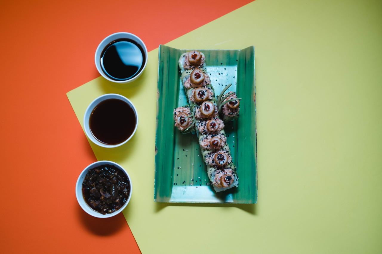 Por fuera: alga nori, salmón, aguacate, tampico y masago, por dentro: queso crema, pulpo, aguacate y pepino.
