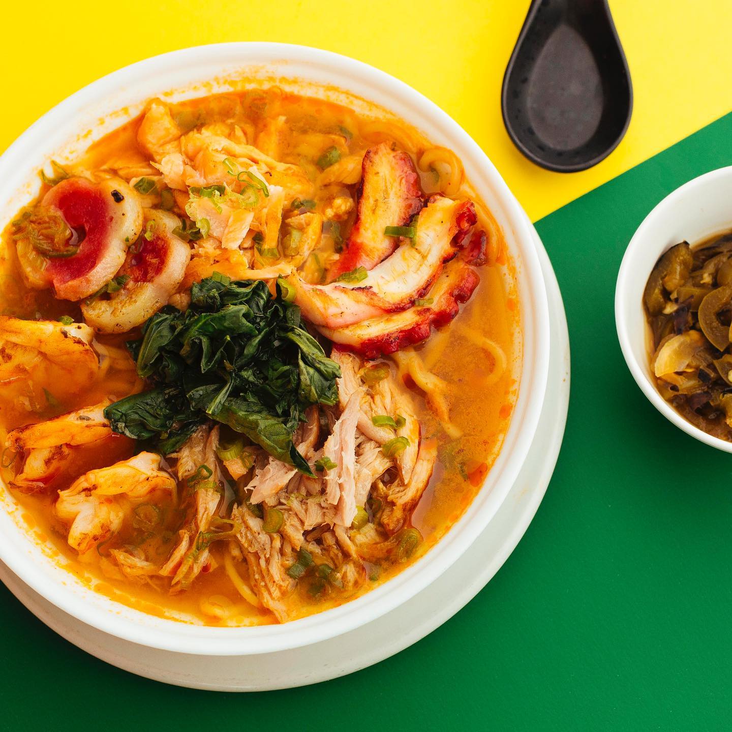 Sopa a base de pescado, con pulpo, camarón, huevo duro, salmón, espinacas, cebollin y noodles ligeramente picante.