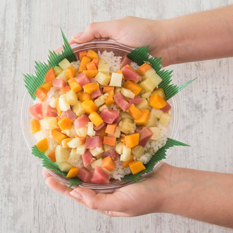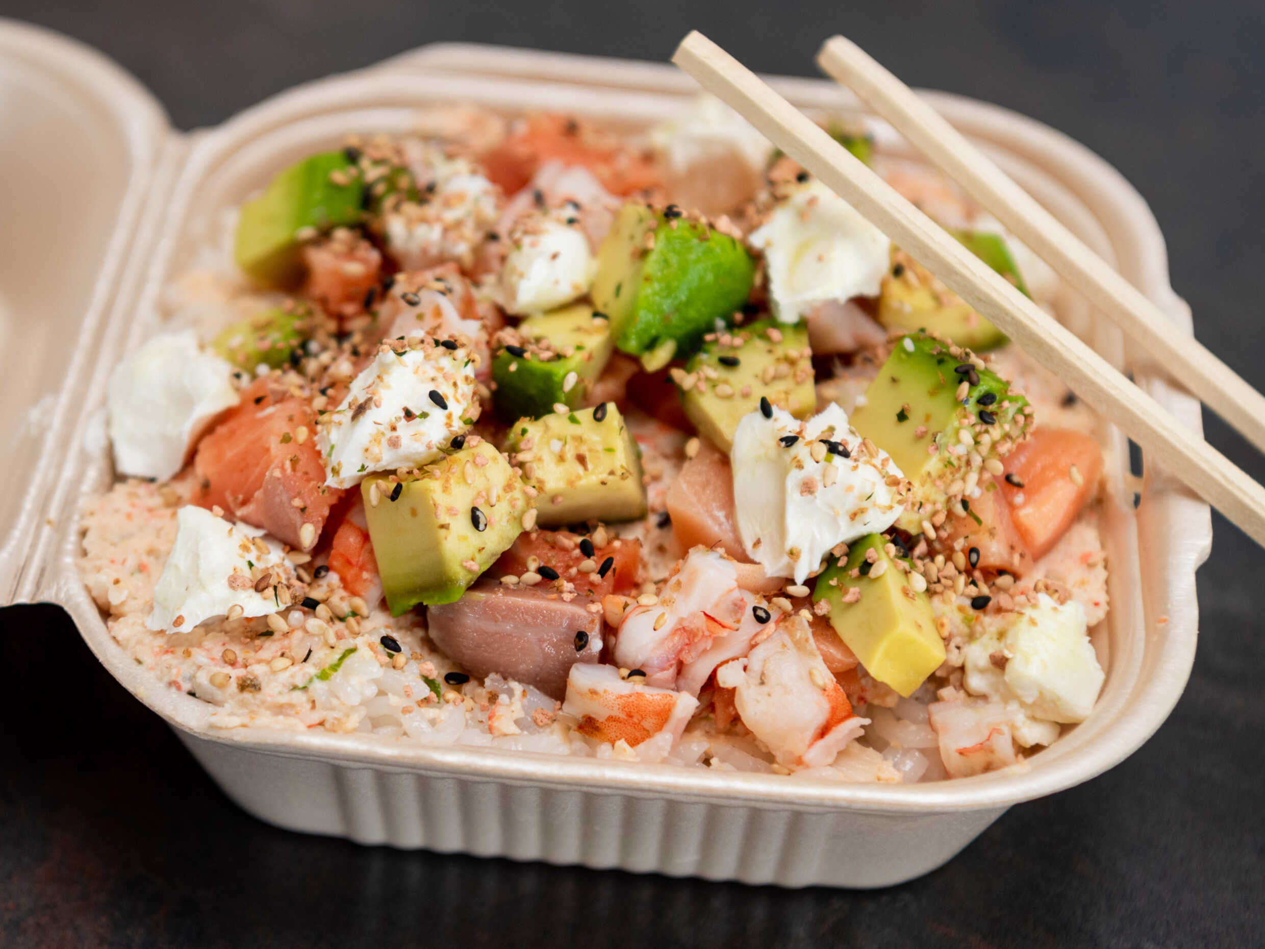 Arroz blanco, pasta tampico, res, pollo, aguacate, queso crema y furikake.