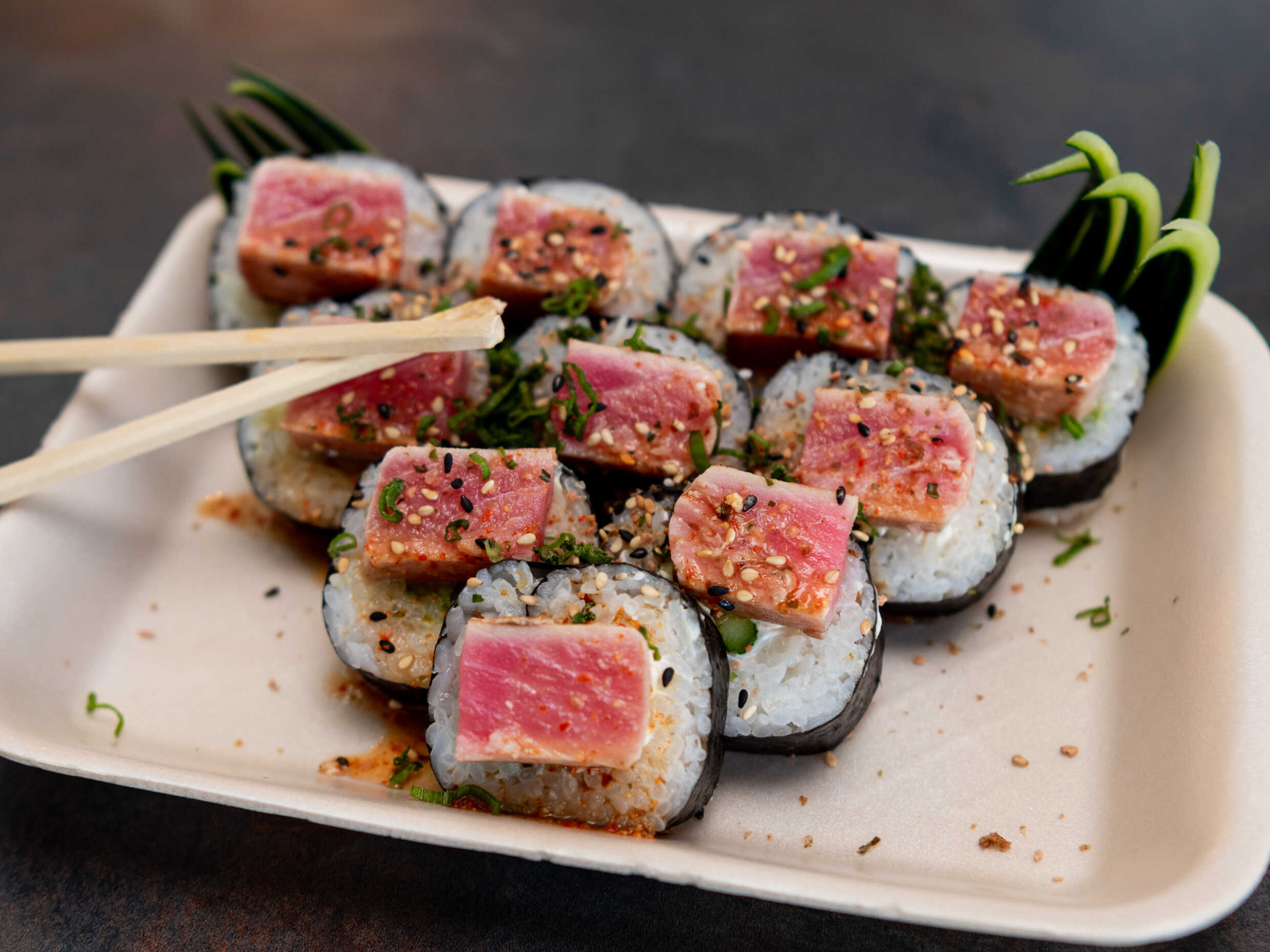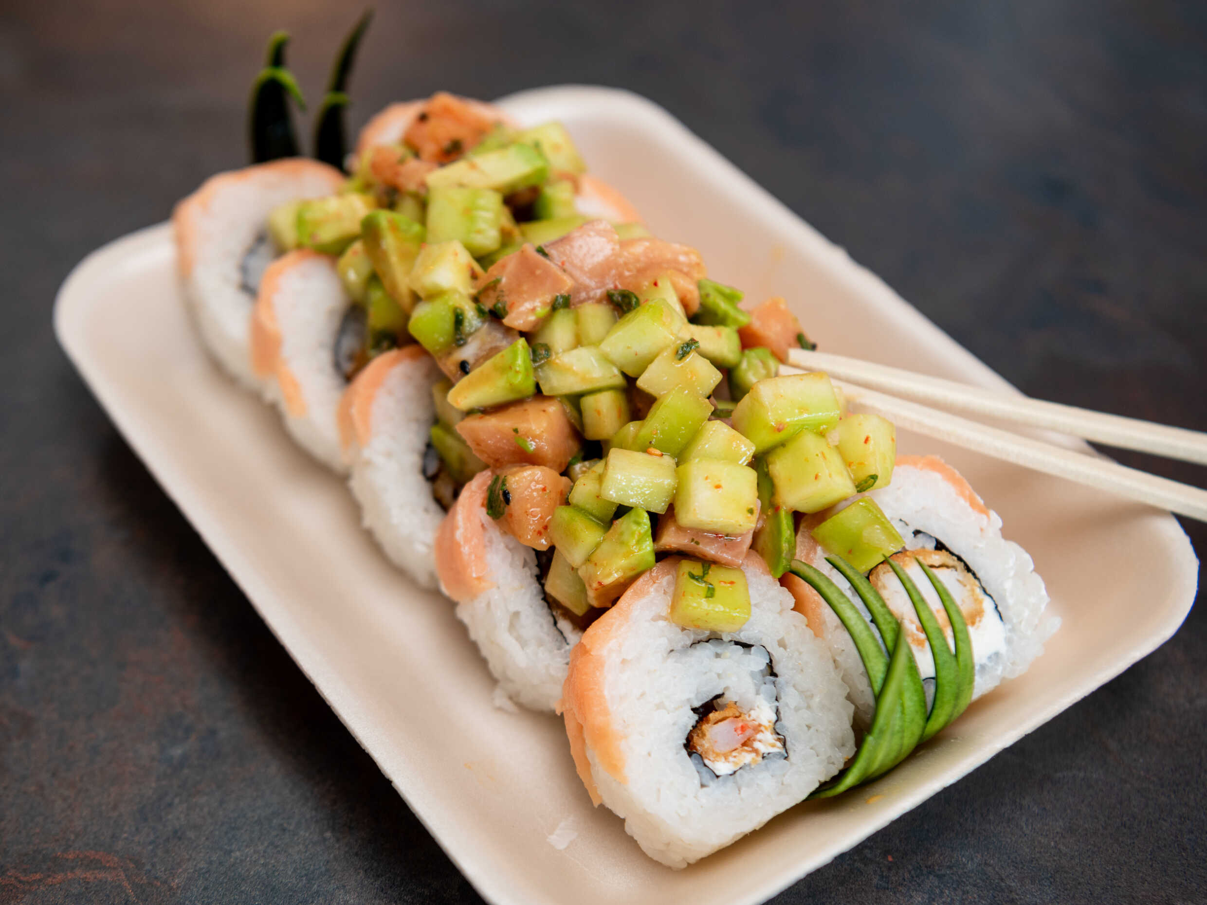 Por fuera: atún flameado y mango estilo cevichito, por dentro: queso crema, aguacate y pepino.
