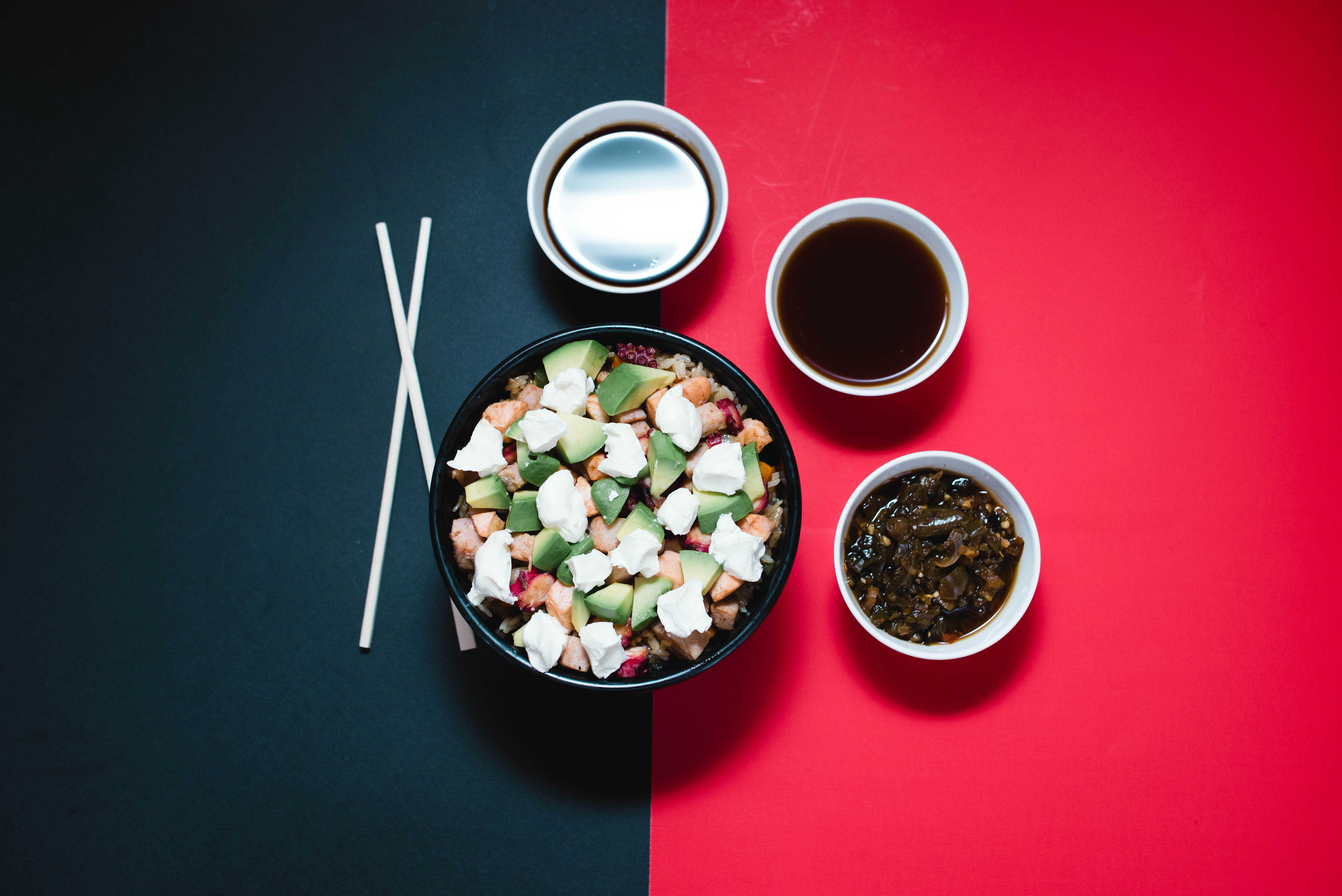 Arroz frito a la plancha sazonado con la receta de la casa, acompañado de pulpo, atún, salmón, aguacate y queso crema. **NO INCLUYE SALSAS**