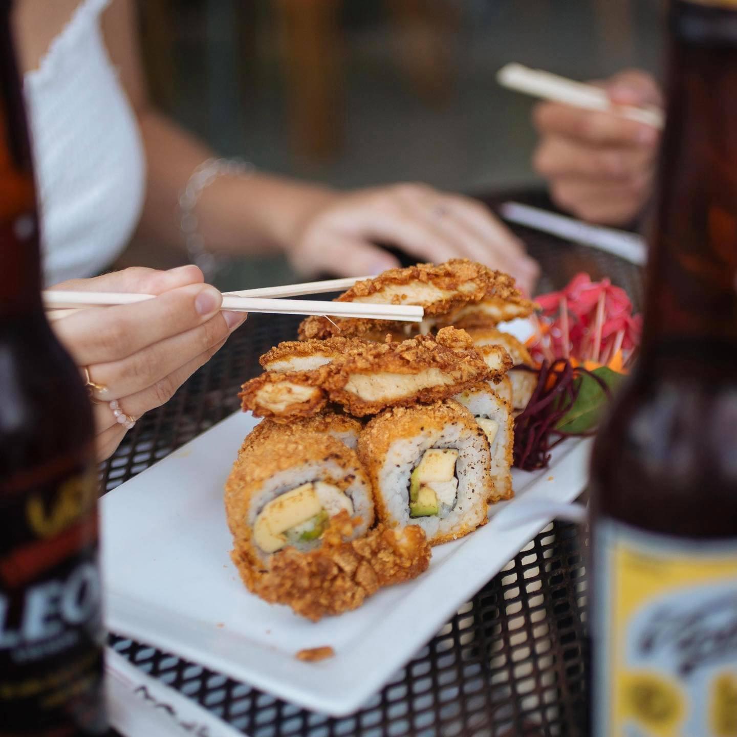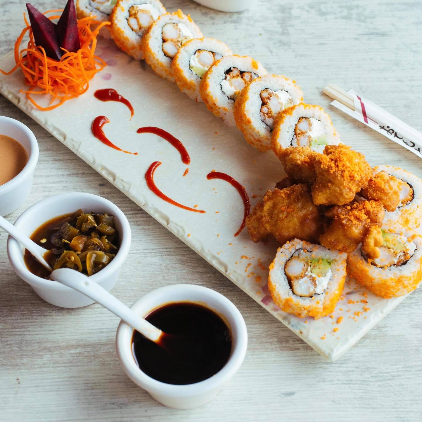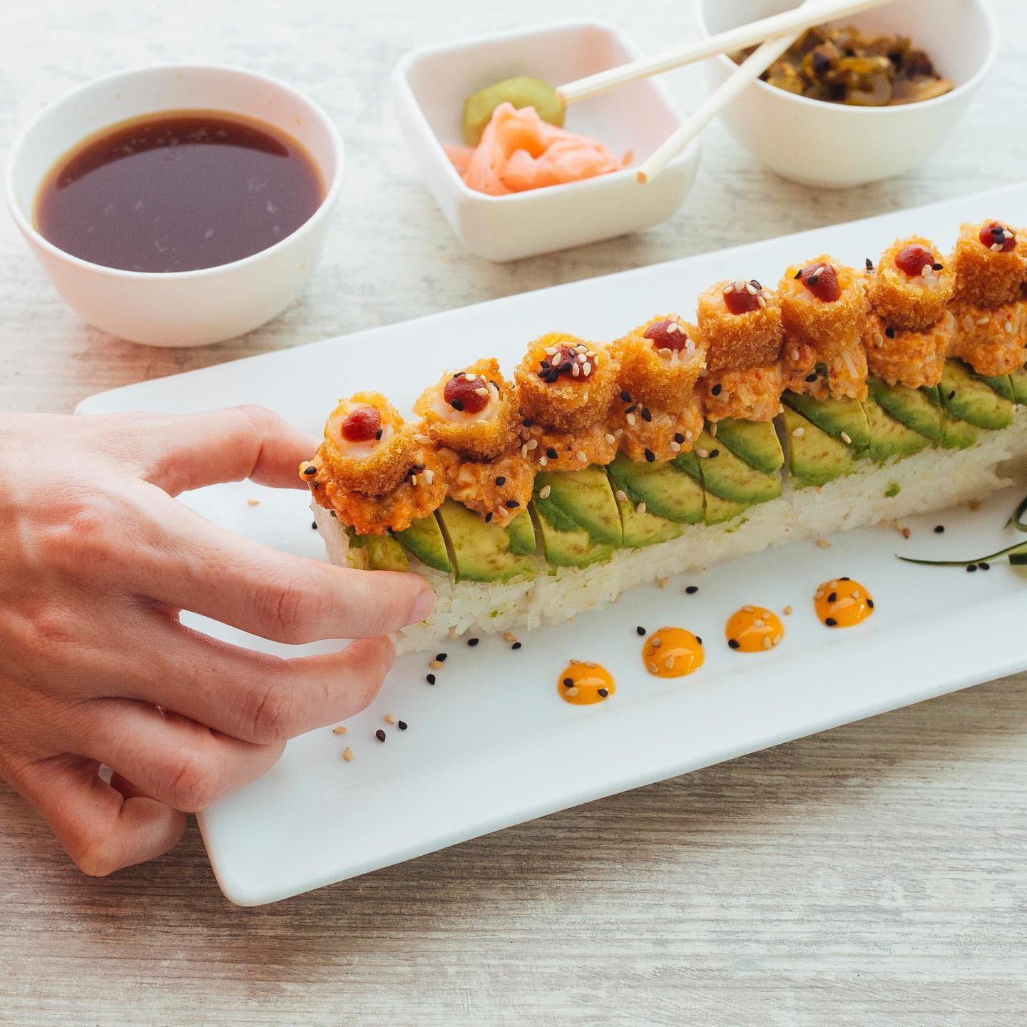 P/F Aguacate, tampico chipotle, camarón empanizado, siriacha y ajonjolí P/D pepino y queso crema
