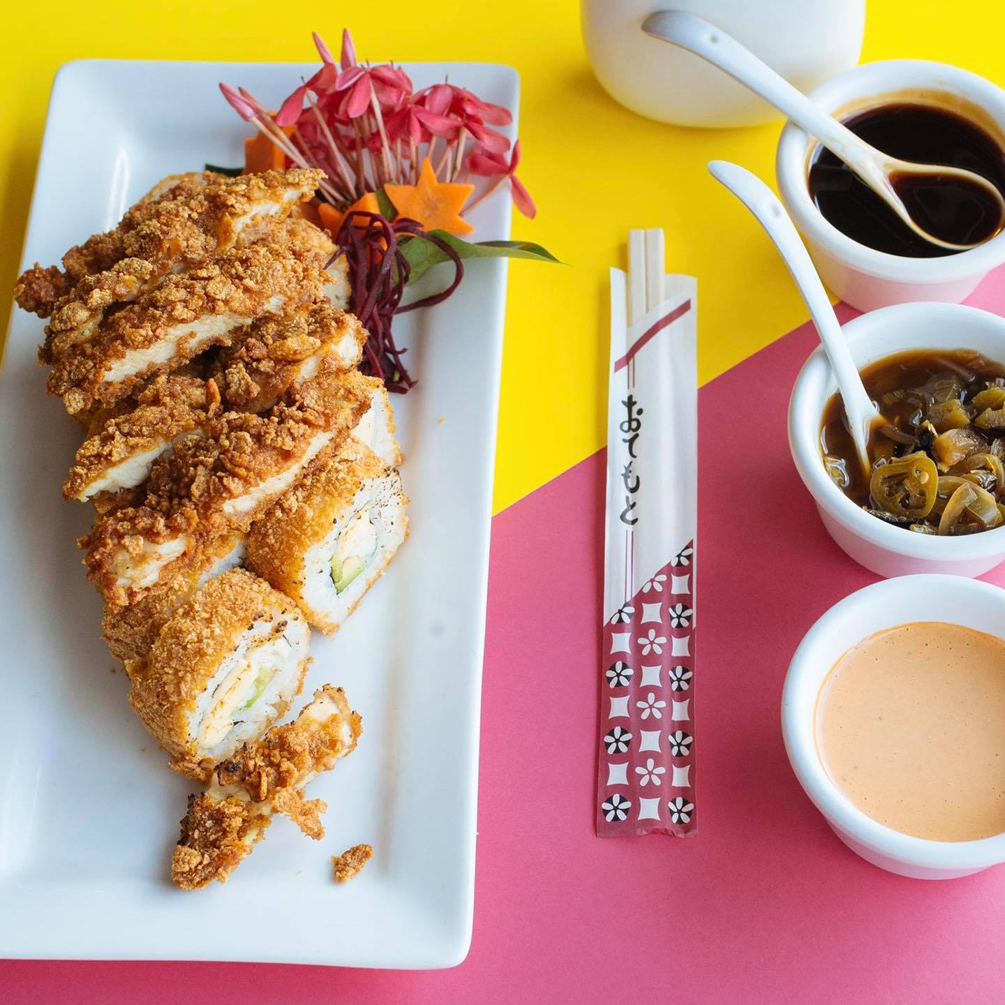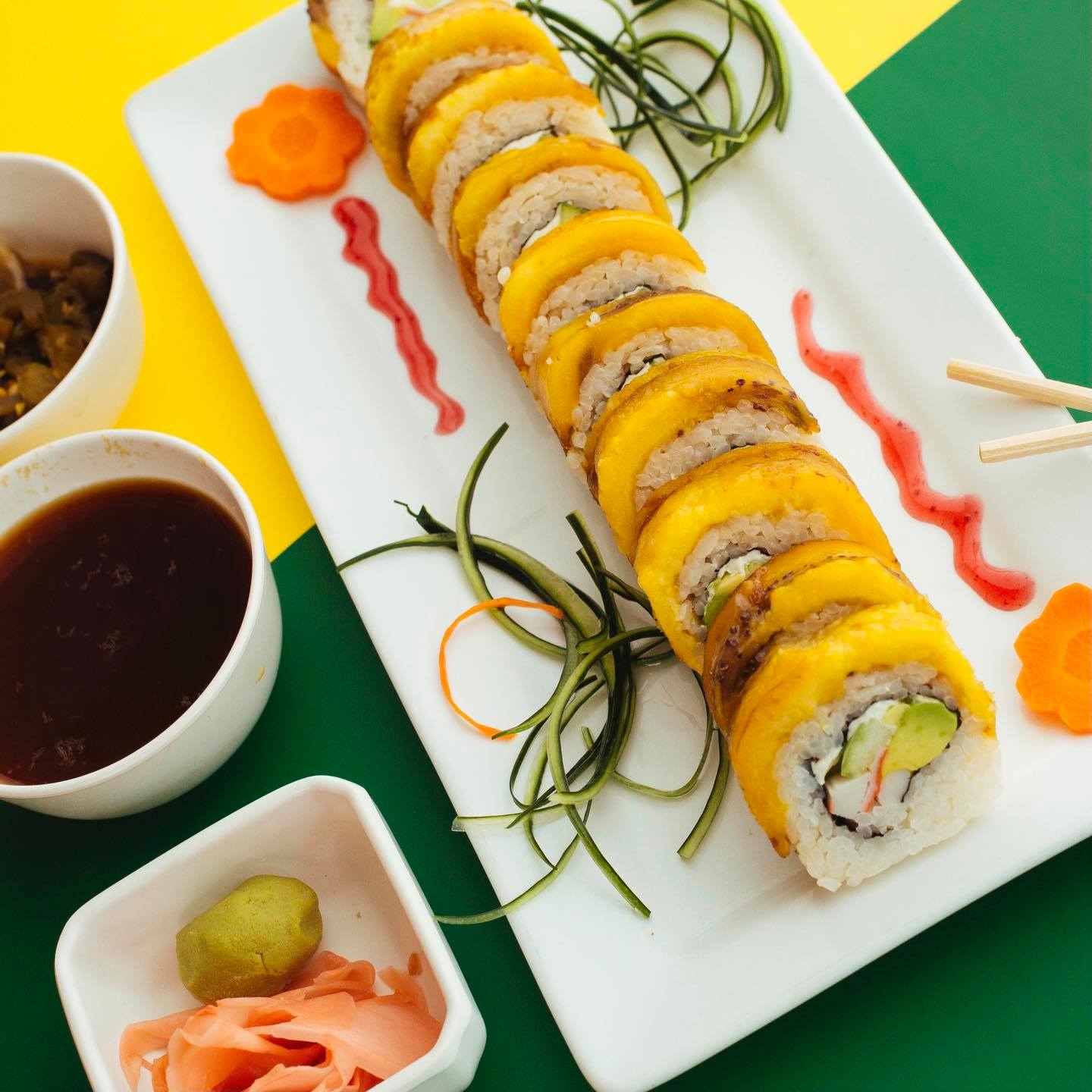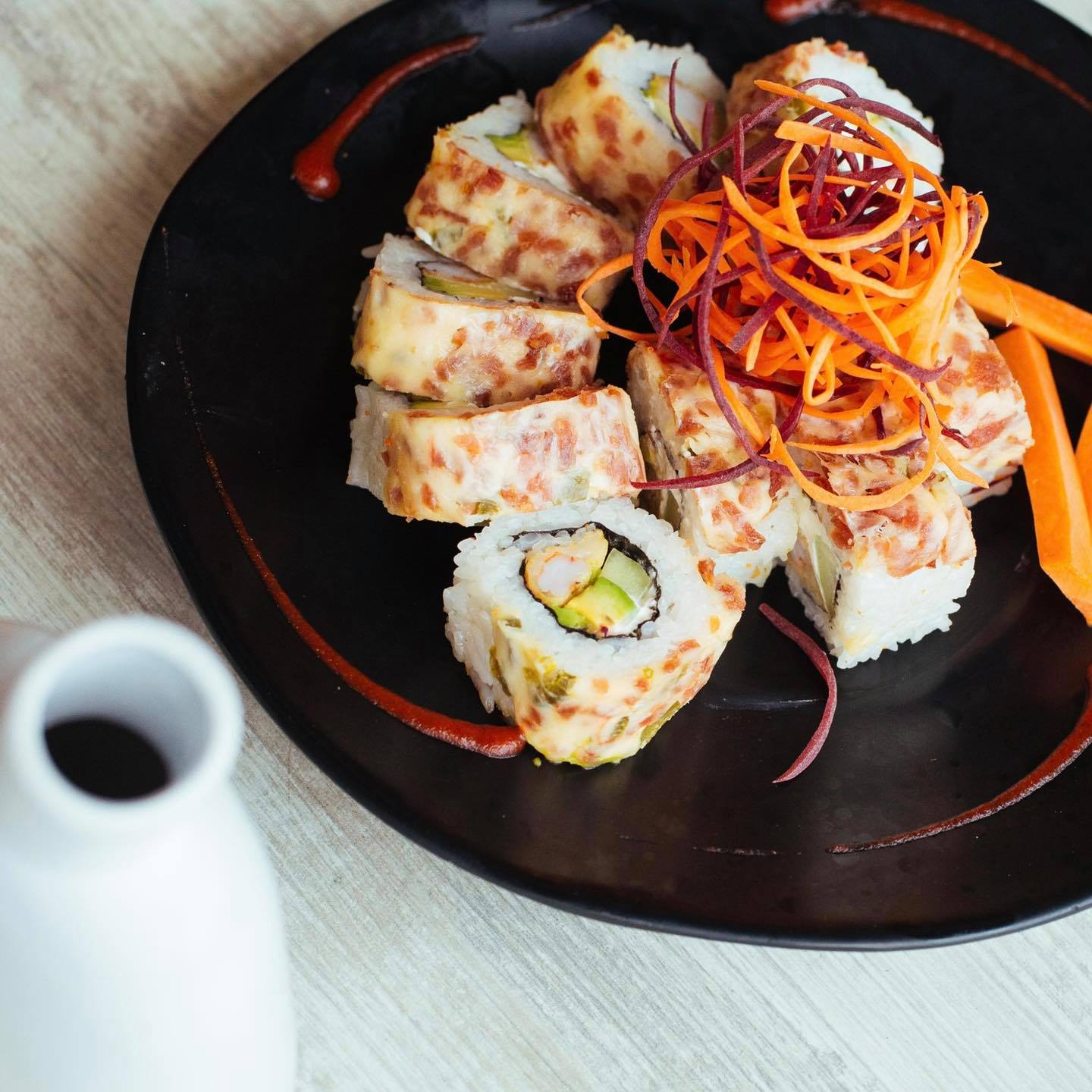 P/F Aguacate, tampico chipotle, camarón empanizado, siriacha y ajonjolí P/D pepino y queso crema