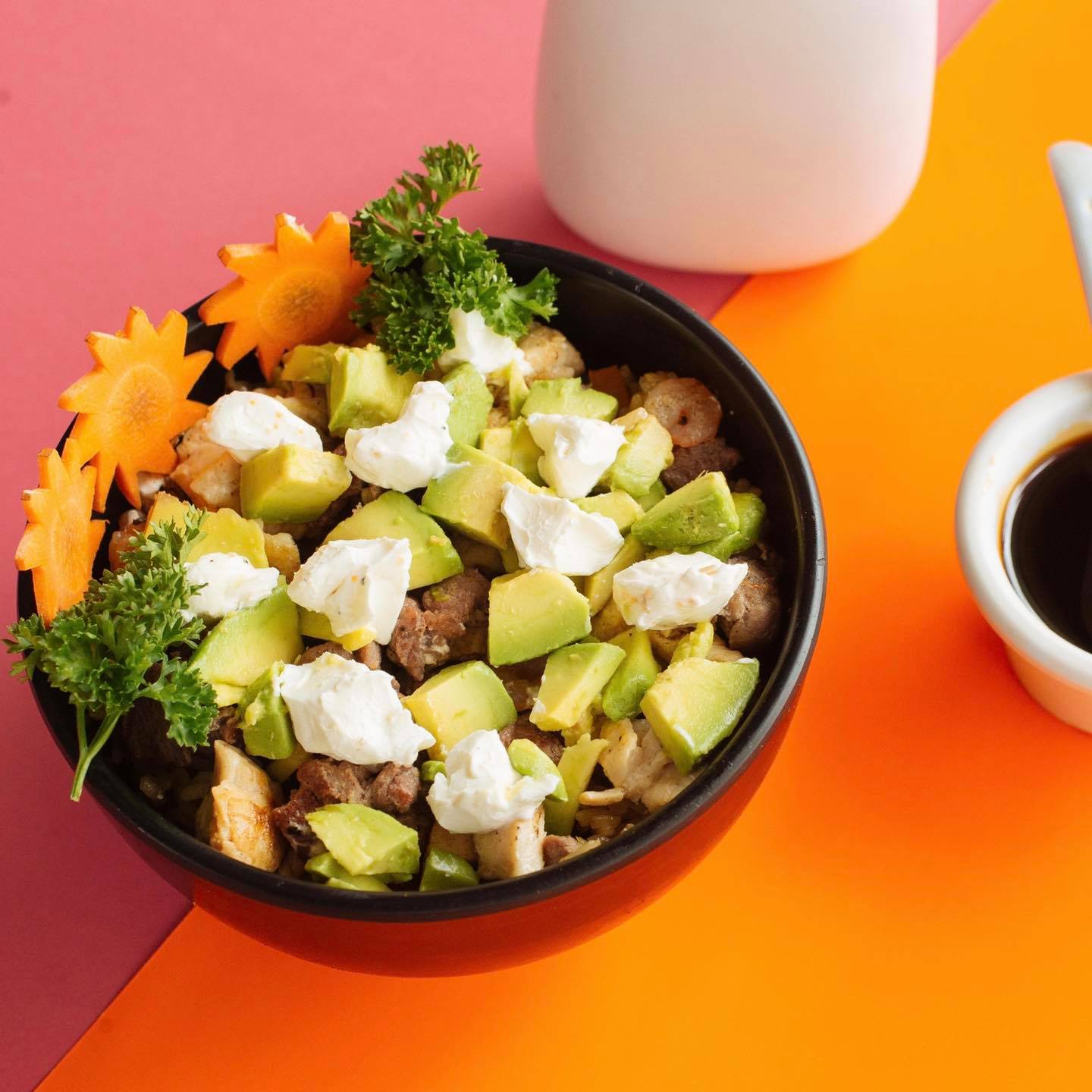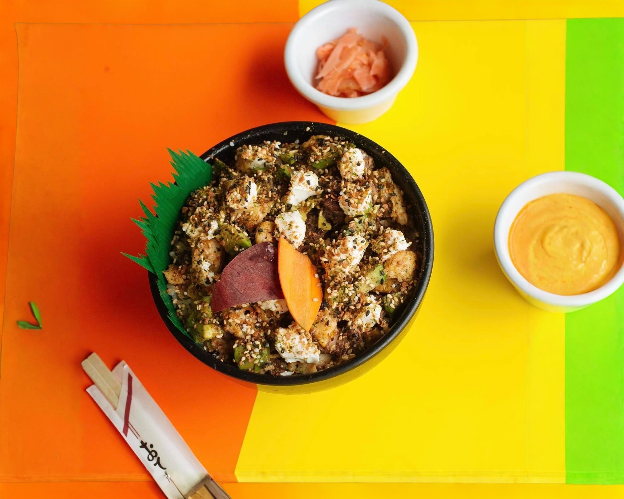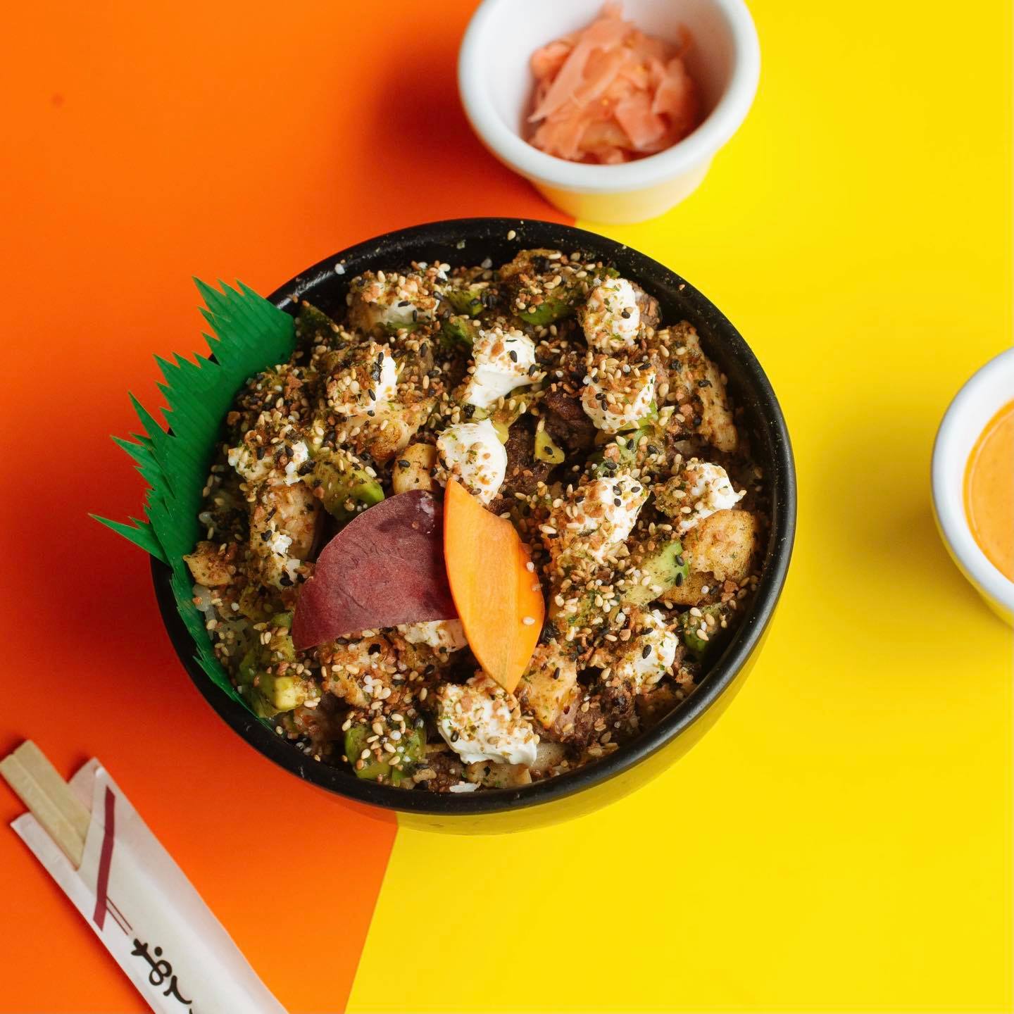 Res, pollo, furikake, tampico, queso crema y aguacate
