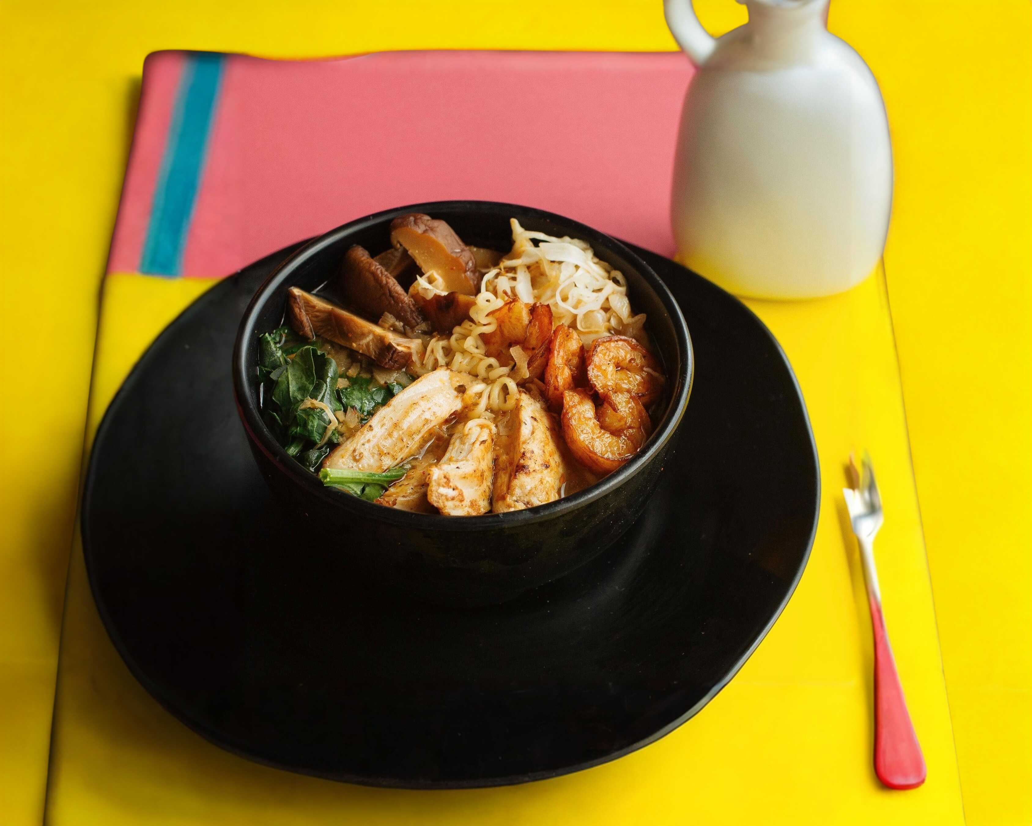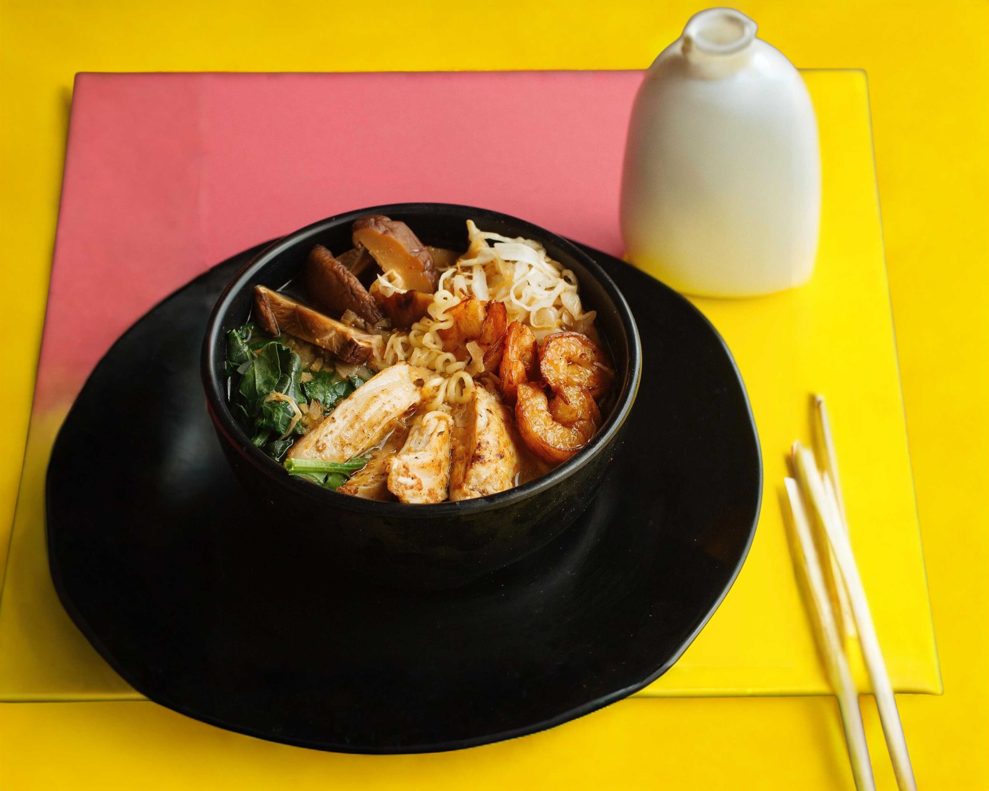 A base de pollo, piel de salmón crunch, camarón, kamaboko, germinadode soya, noodles y elote
