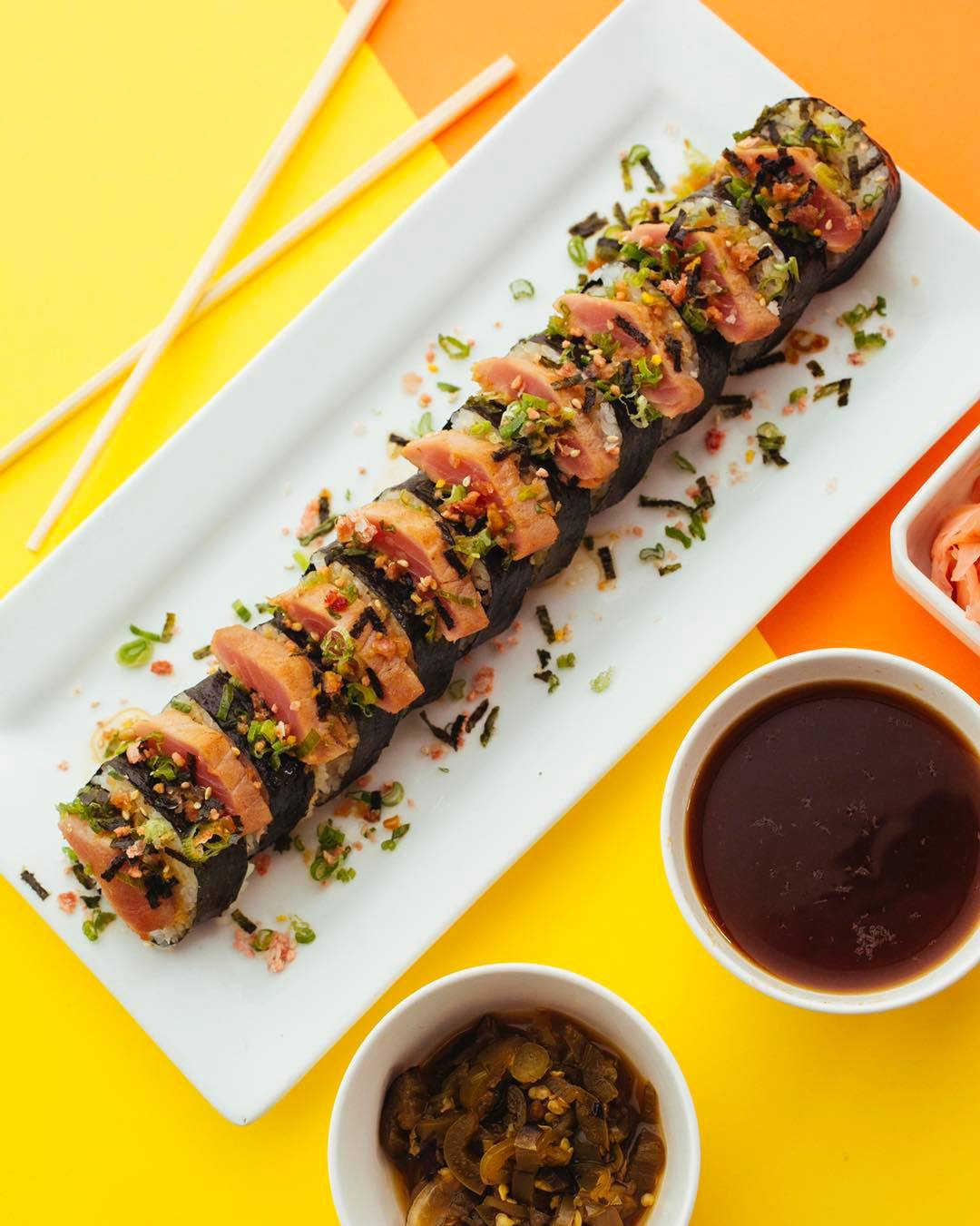 P/F Alga y encima atún sellado bañado con una vinagreta especial, funikake y cebollín espolvoreado P/D esparrago, queso de cabra, queso crema y aguacate