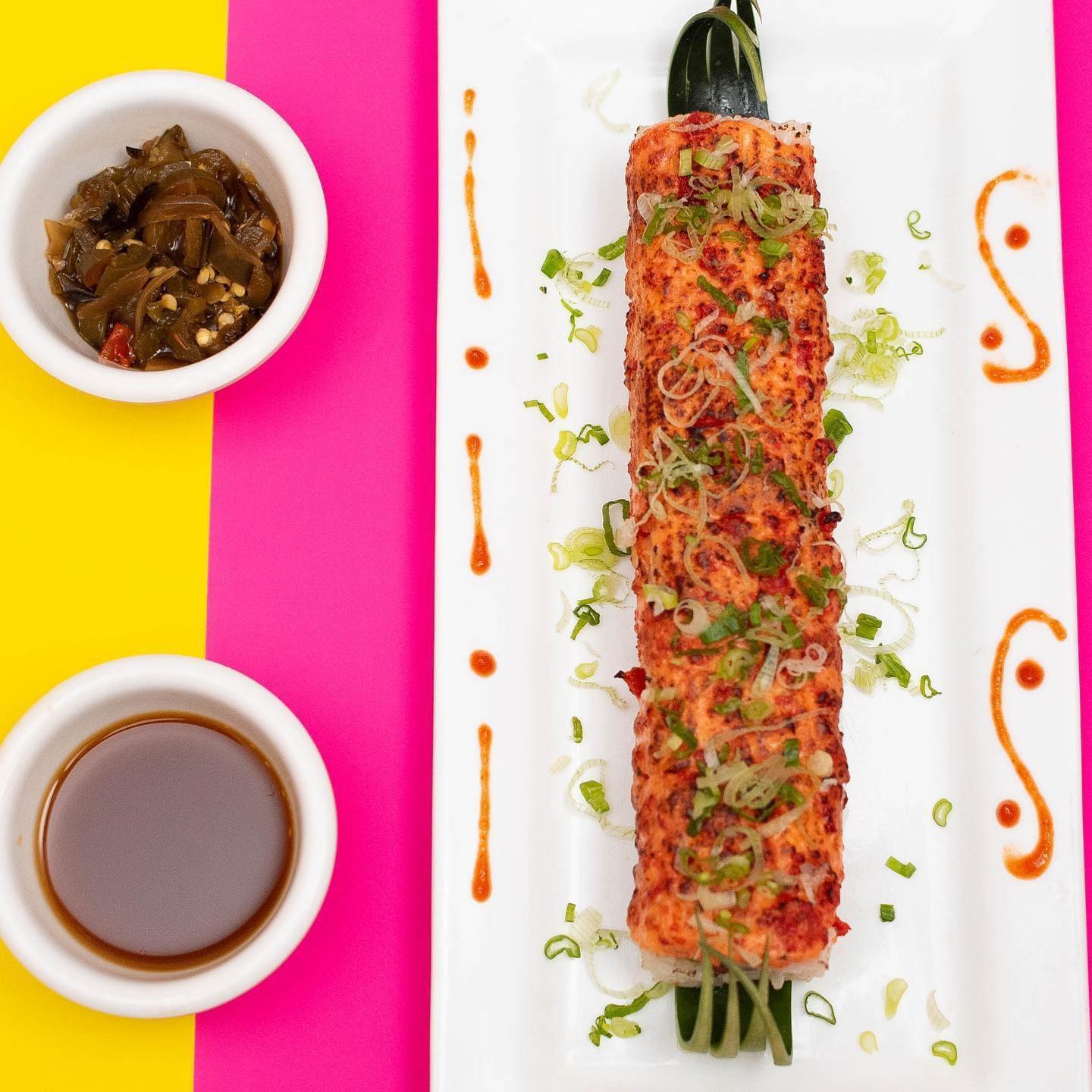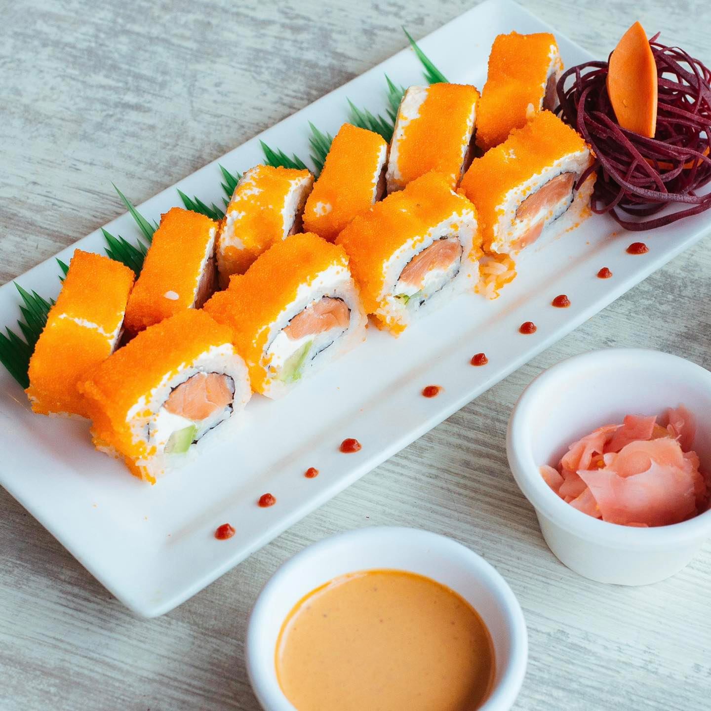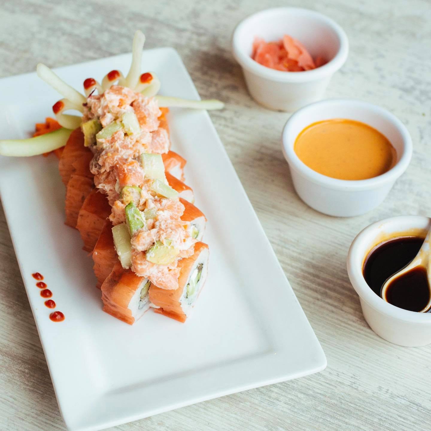 Por fuera Salmon flameado punteado con salsa spicy y salsa siriacha. Por dentro atun, queso crema, pepino y aguacate.