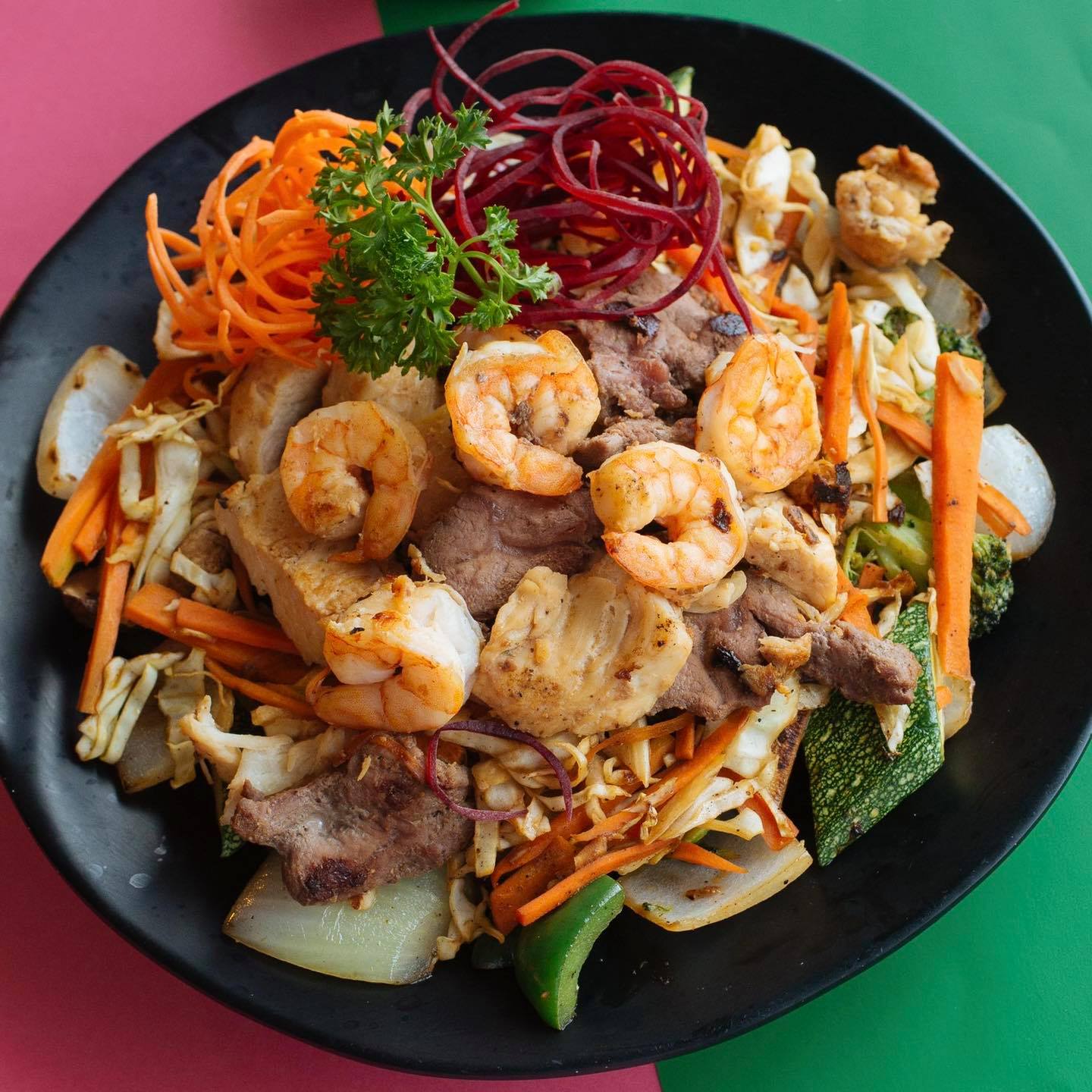Deliciosa combinación de arroz frito con verduras, pollo, camarón, res y germinado de soya