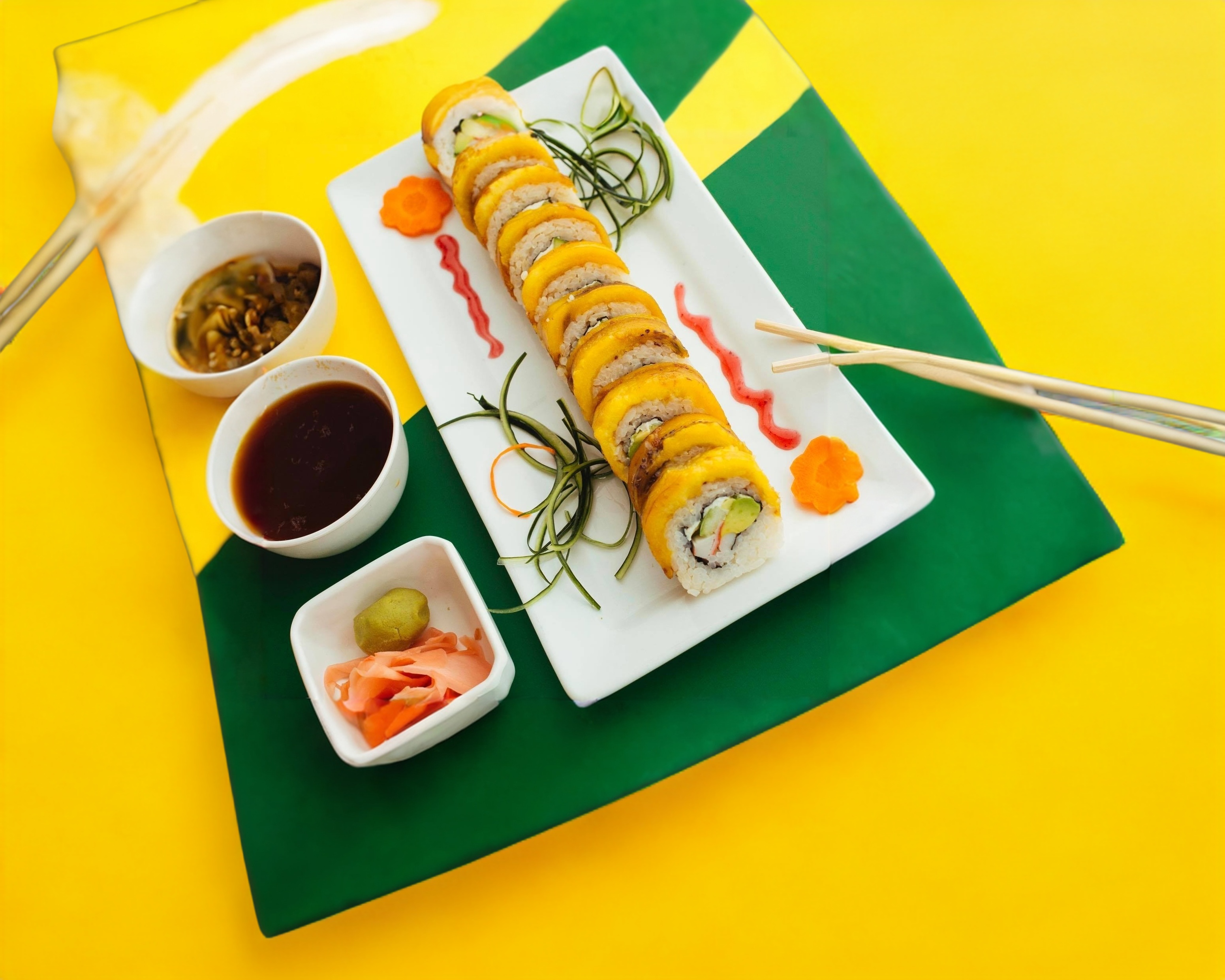 P/F Queso manchego, tocino y chile serrano P/D camarón tempura, aguacate, queso crema y pepino