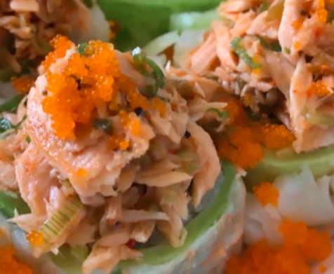 P/F Aguacate y camarón, encima salmón deshebrado a la plancha, aderezado con una salsa especial del chef P/D aguacate, pepino, queso crema y jengibre