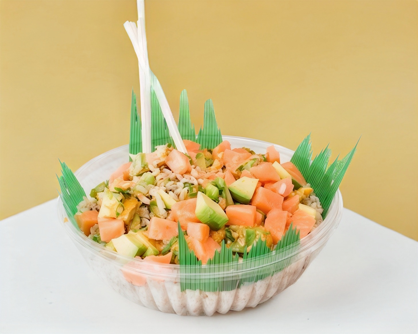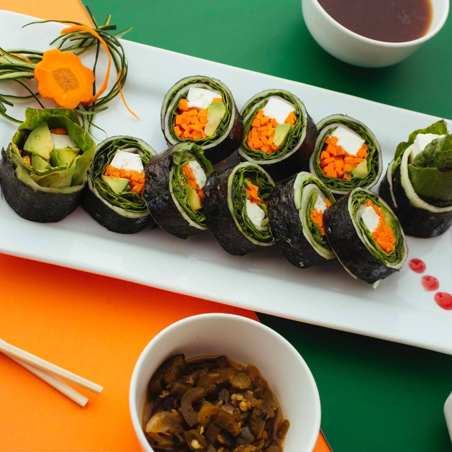P/F Alga, lluvia de zanahoria y pepino P/D lechuga zanahoria, espinaca, aguacate, pepino, germinado de soya y tofu