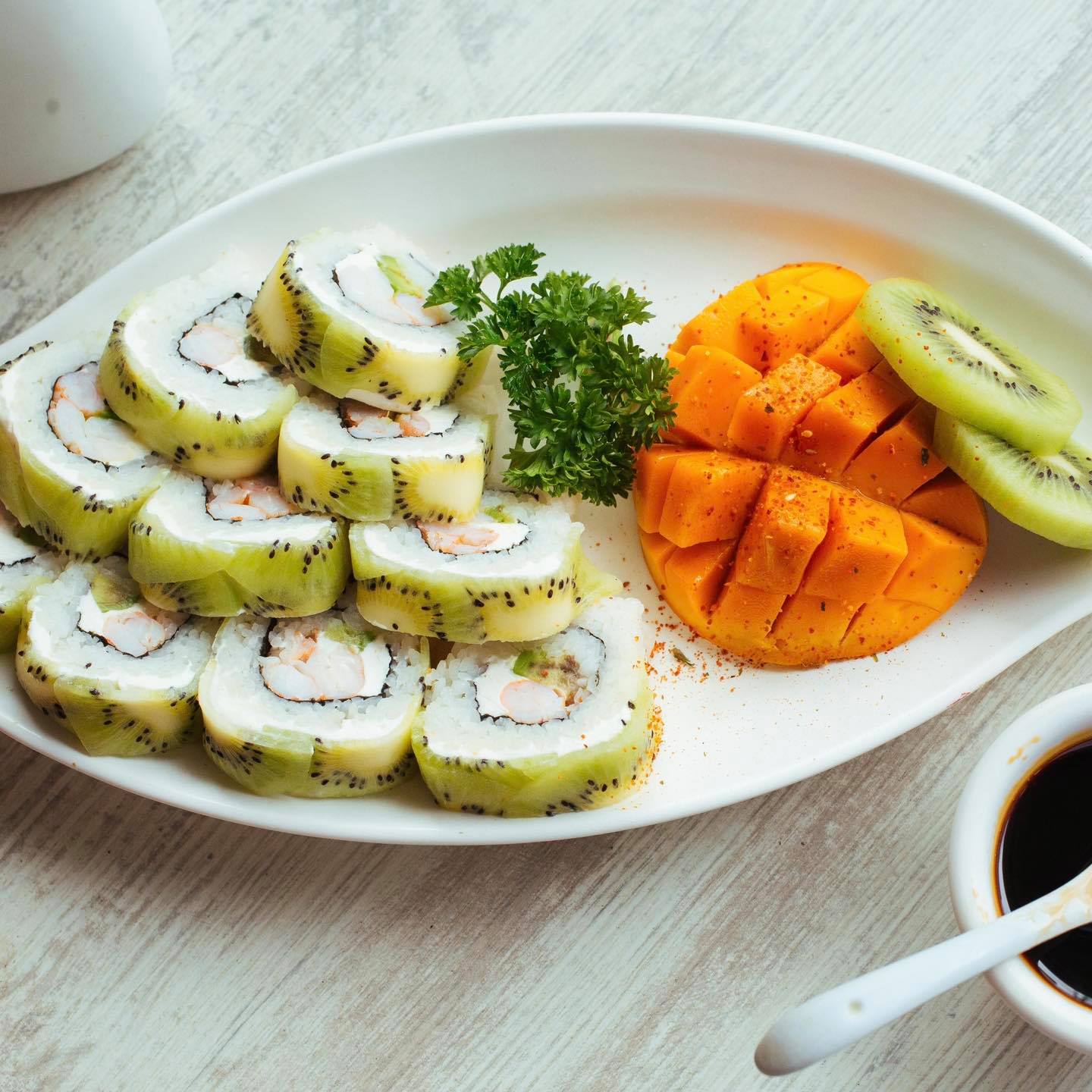 P/F Kiwi, mango, fresa y salsa de anguila P/D Queso Crema, aguacate, pepino y salmón freso