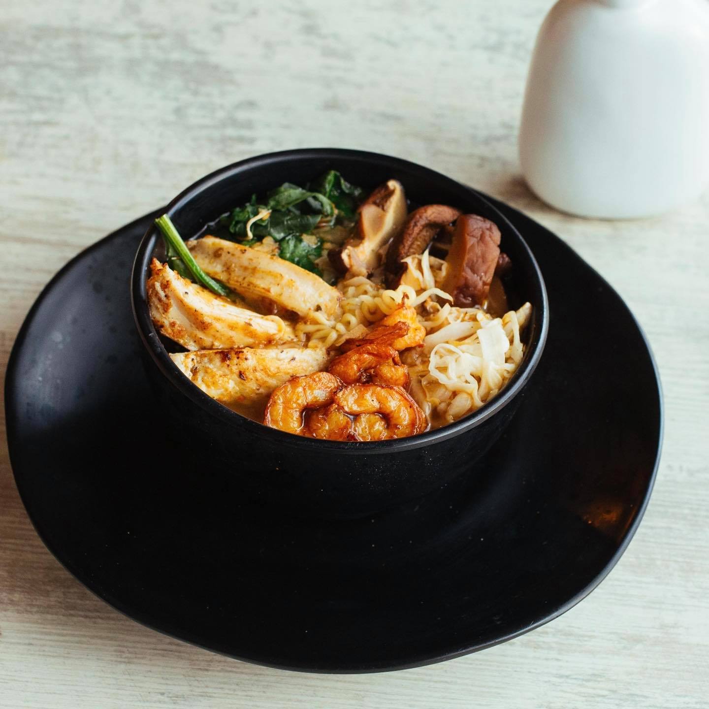 Con pollo, camarón al grill, espinacas, shitake, noodles, huevo duro, brocoli y edamames, alga con un consomé base de jengibre