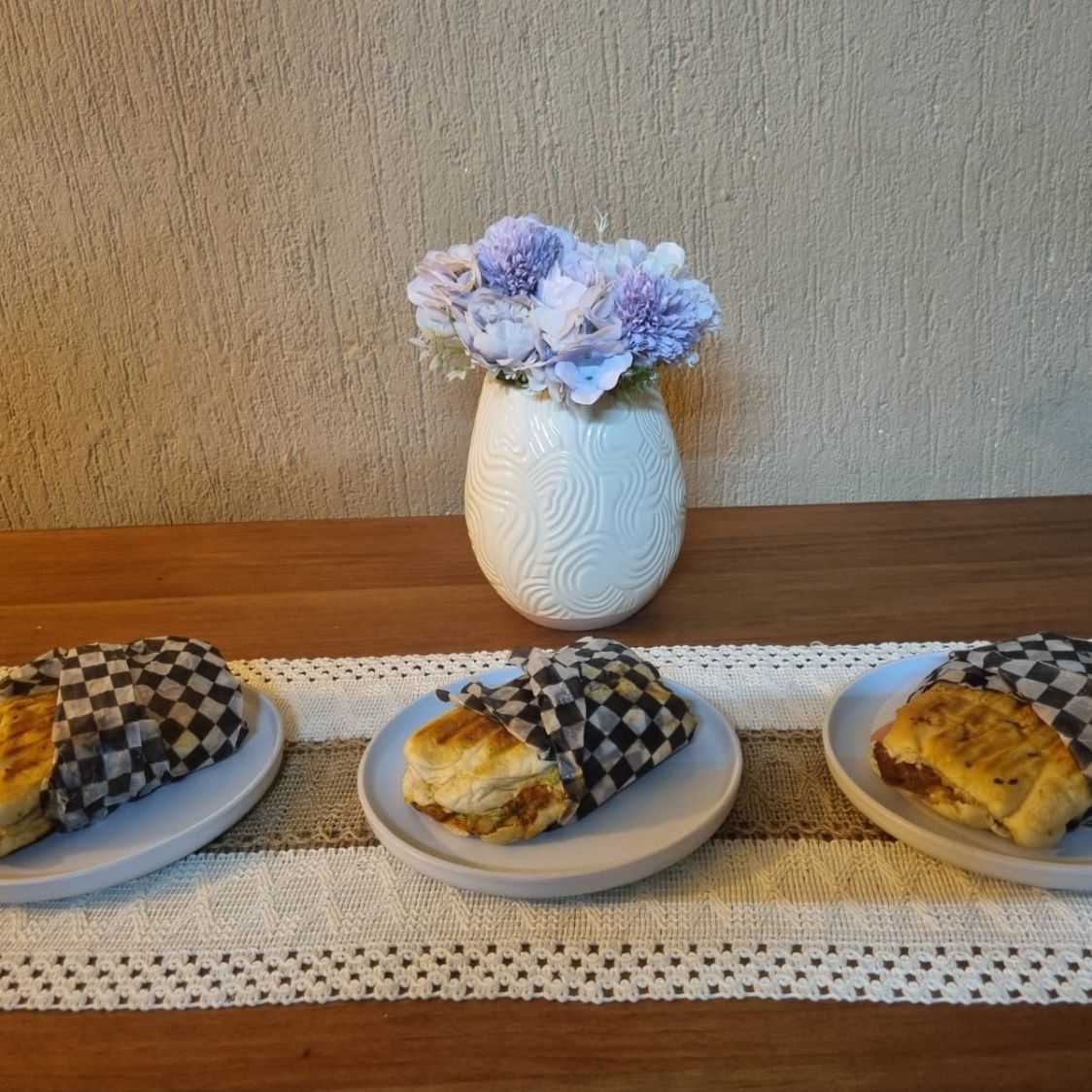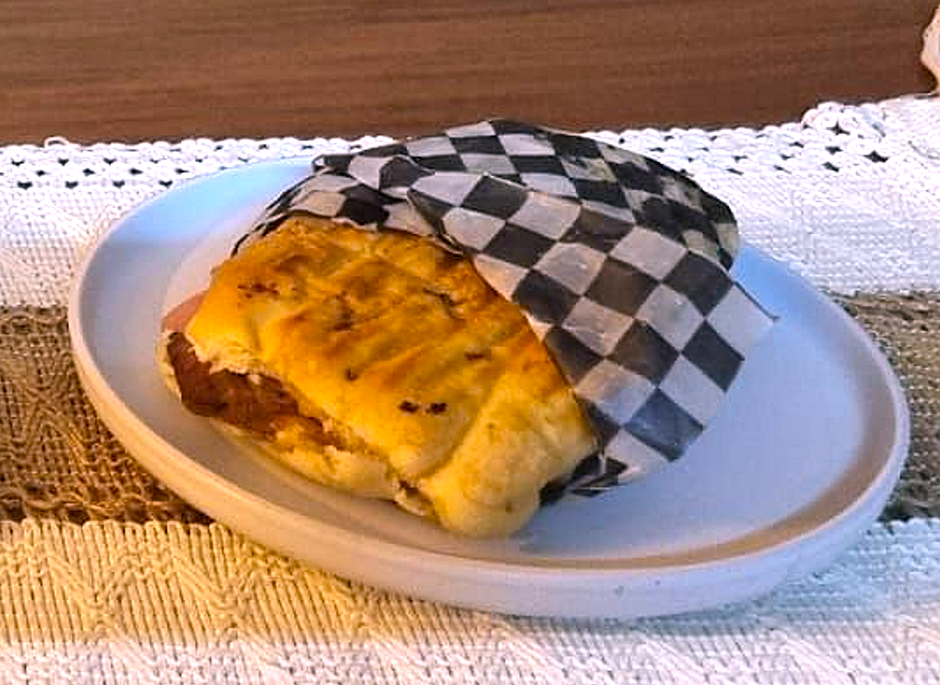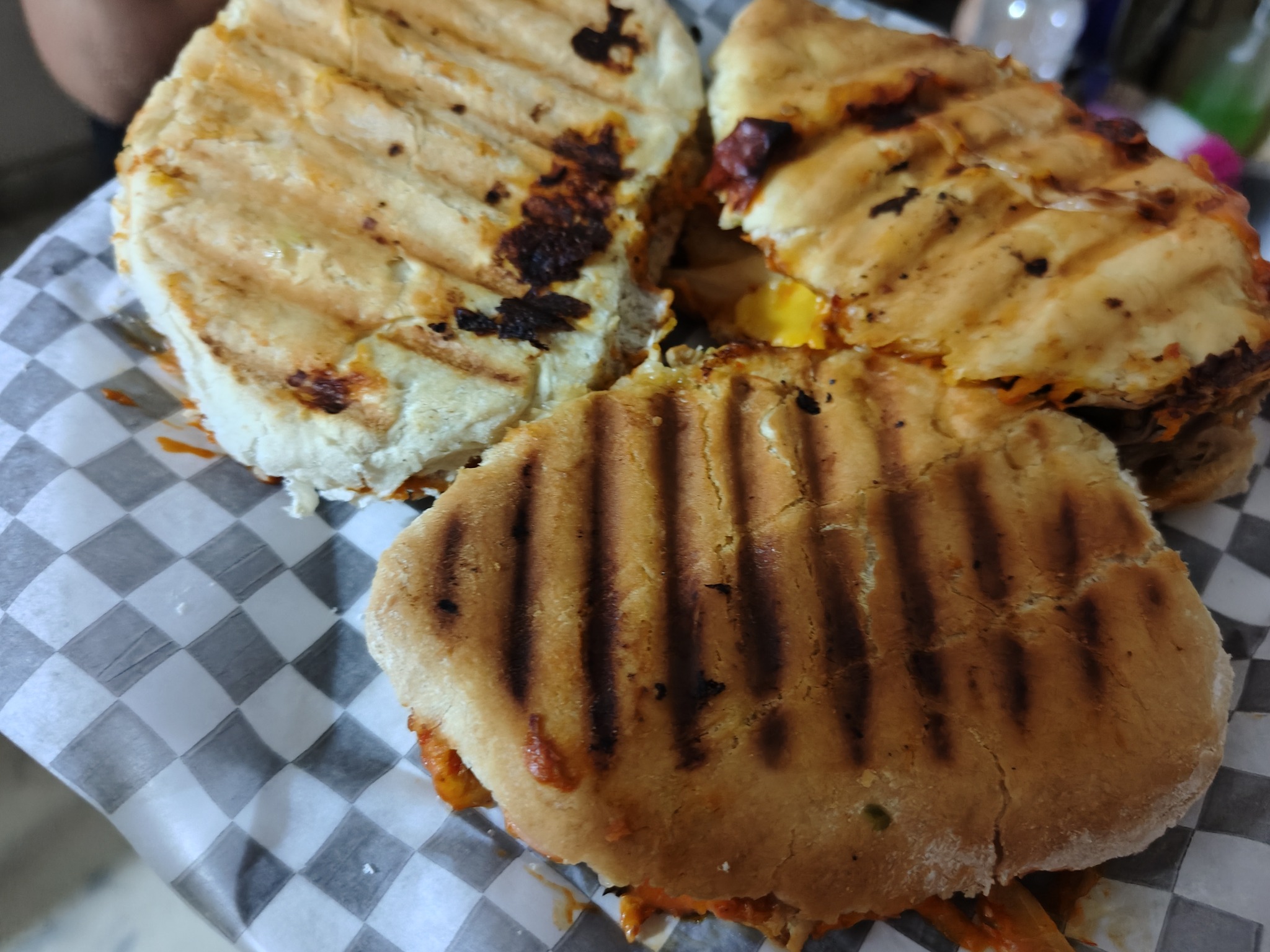 3 Tortas de pan de telera doradito con pierna de cerdo, mayonesa, mantequilla, media crema, cebolla.