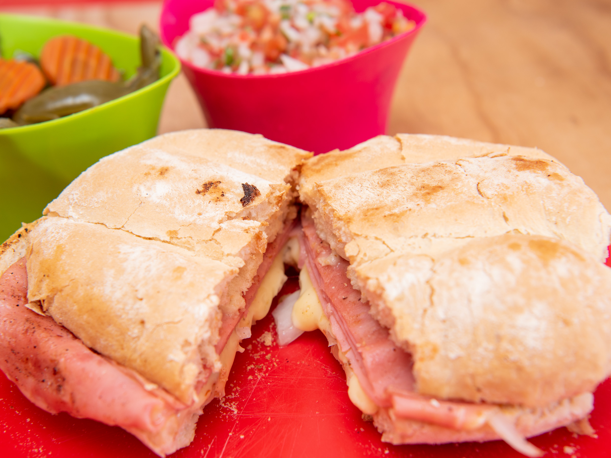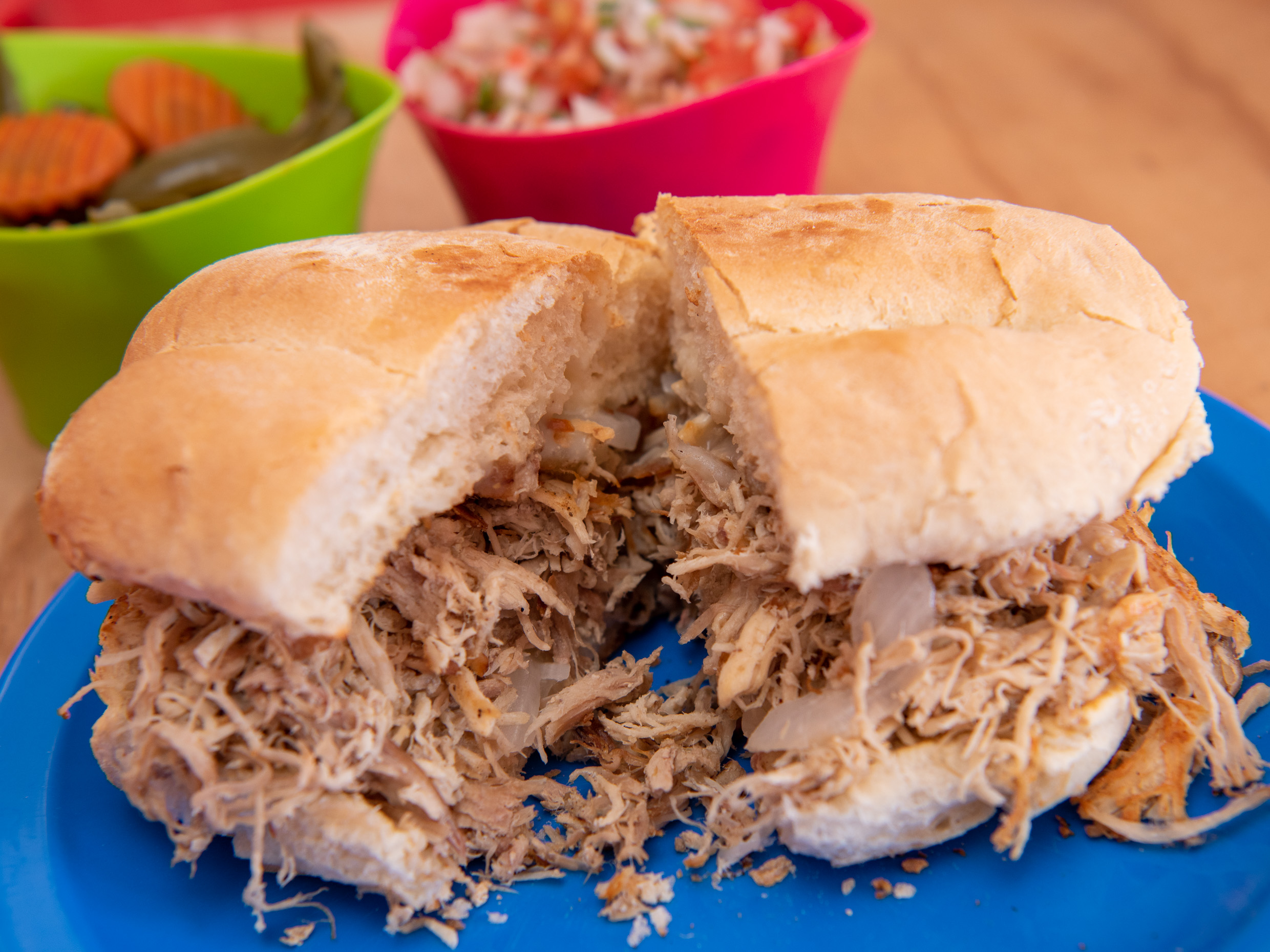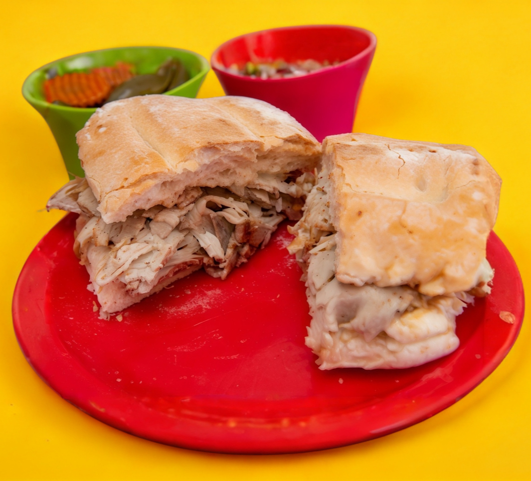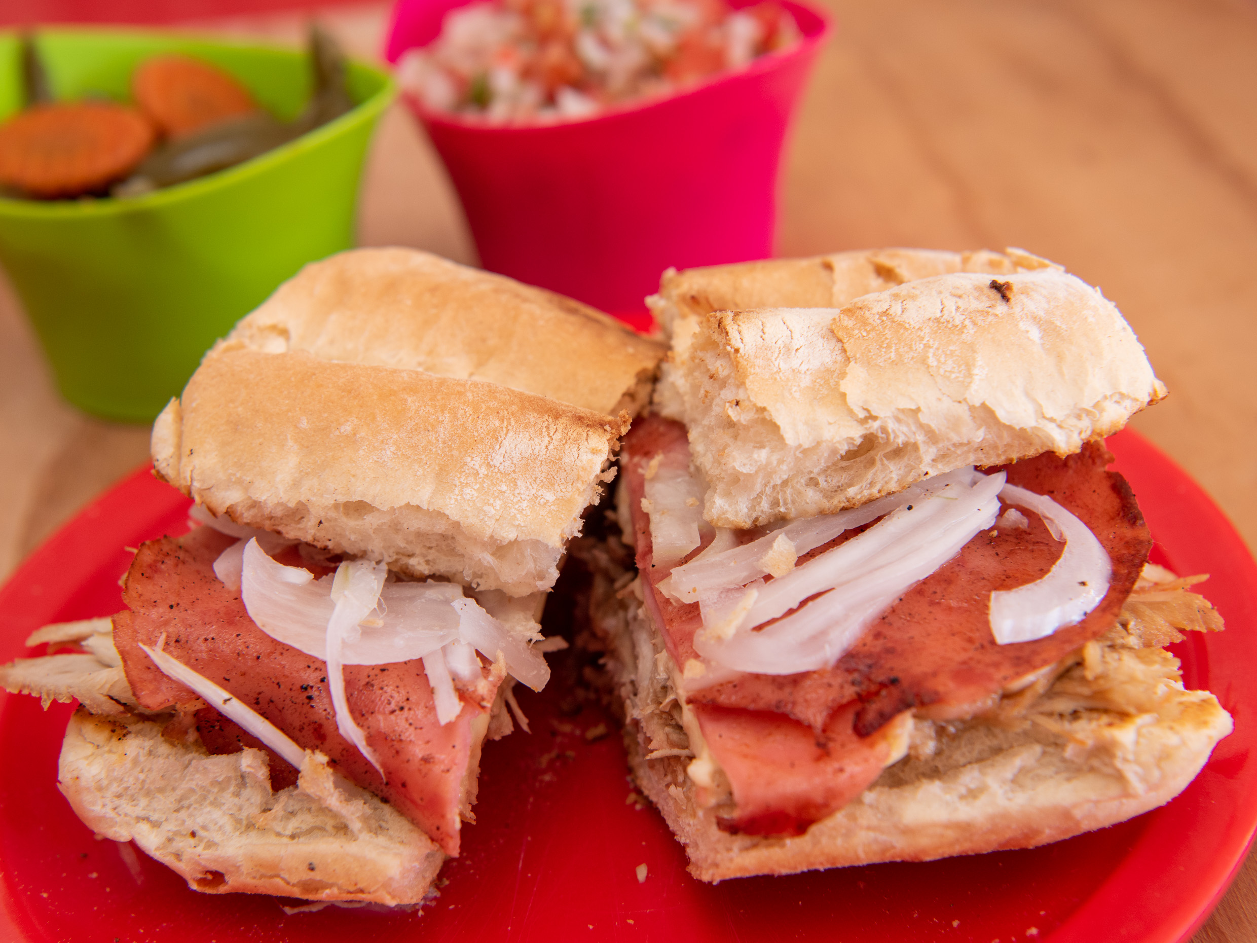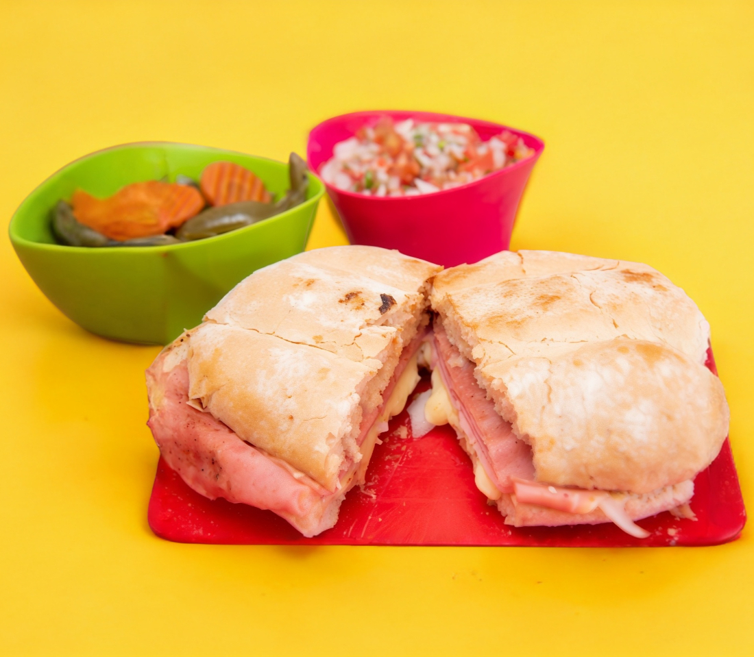 Porción para una persona, la cual incluye: pierna de cerdo rebanada (270 gramos), pan telera (30 gramos), cebolla blanca y mayonesa.