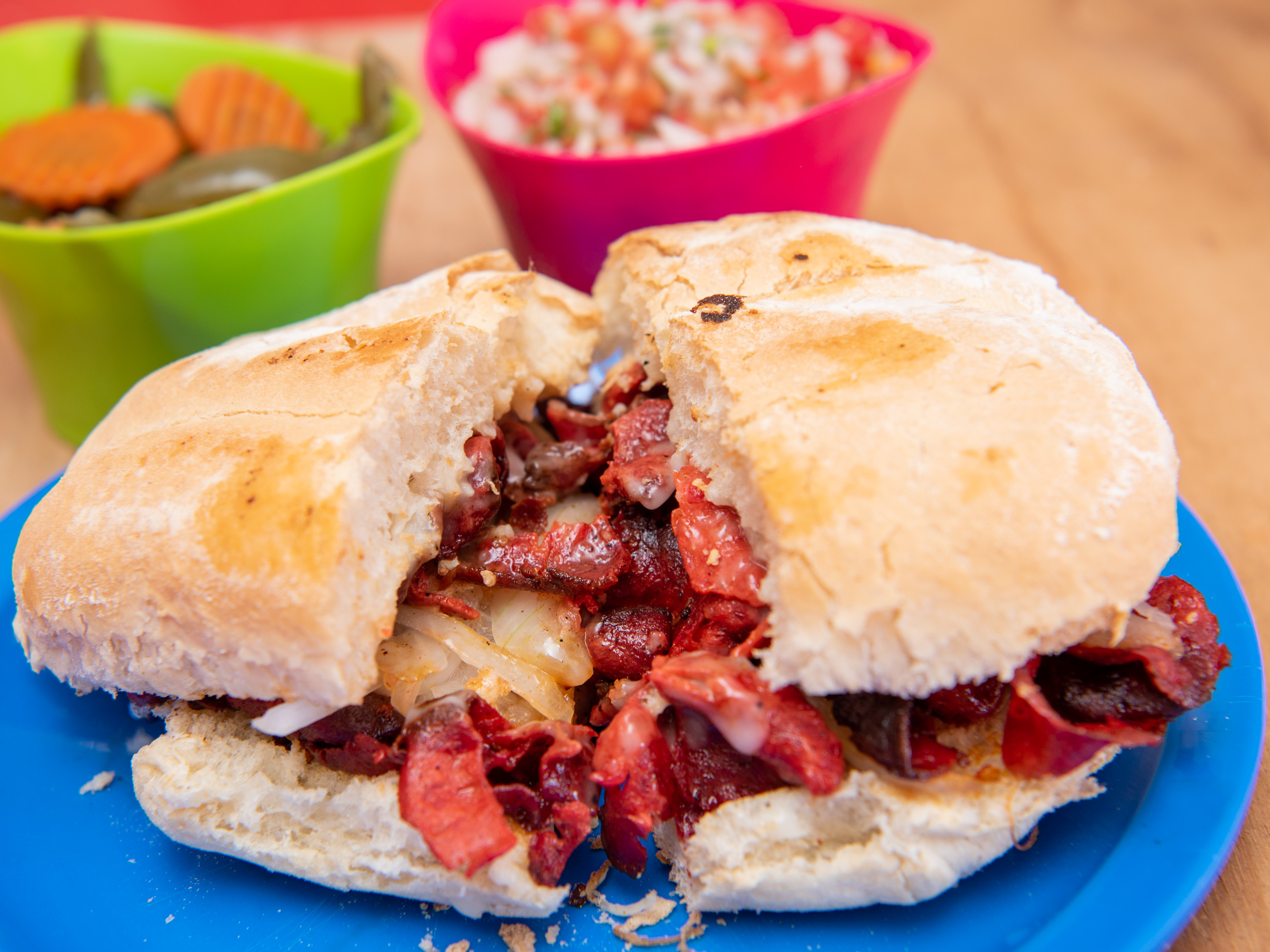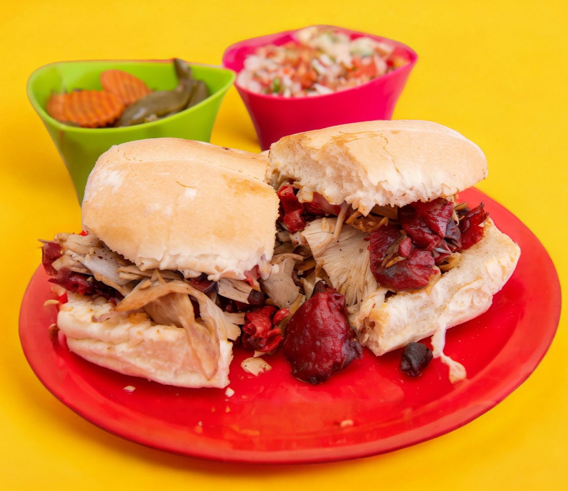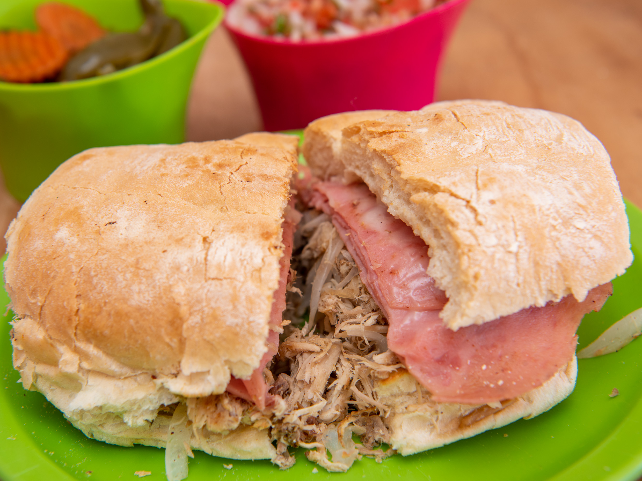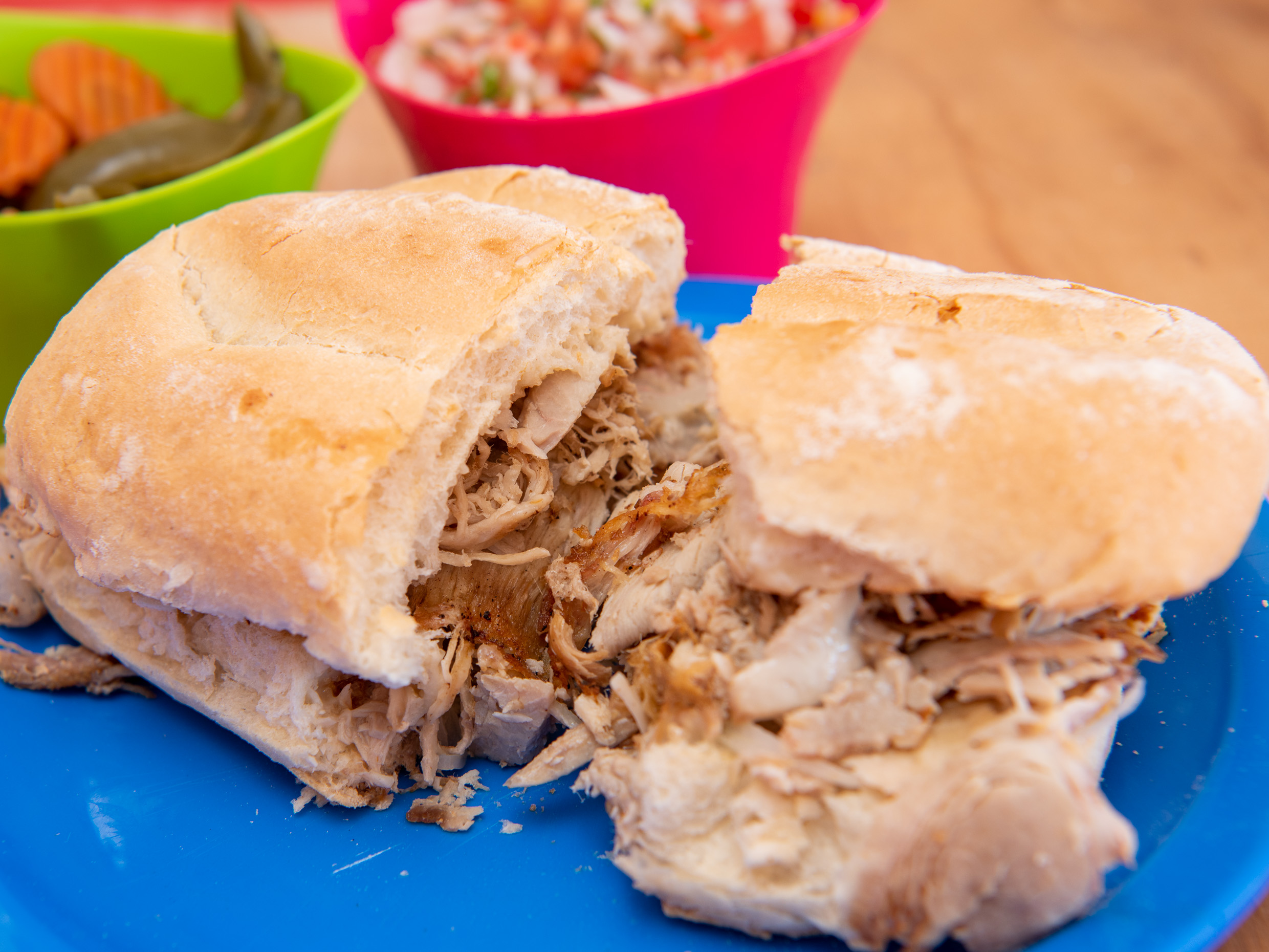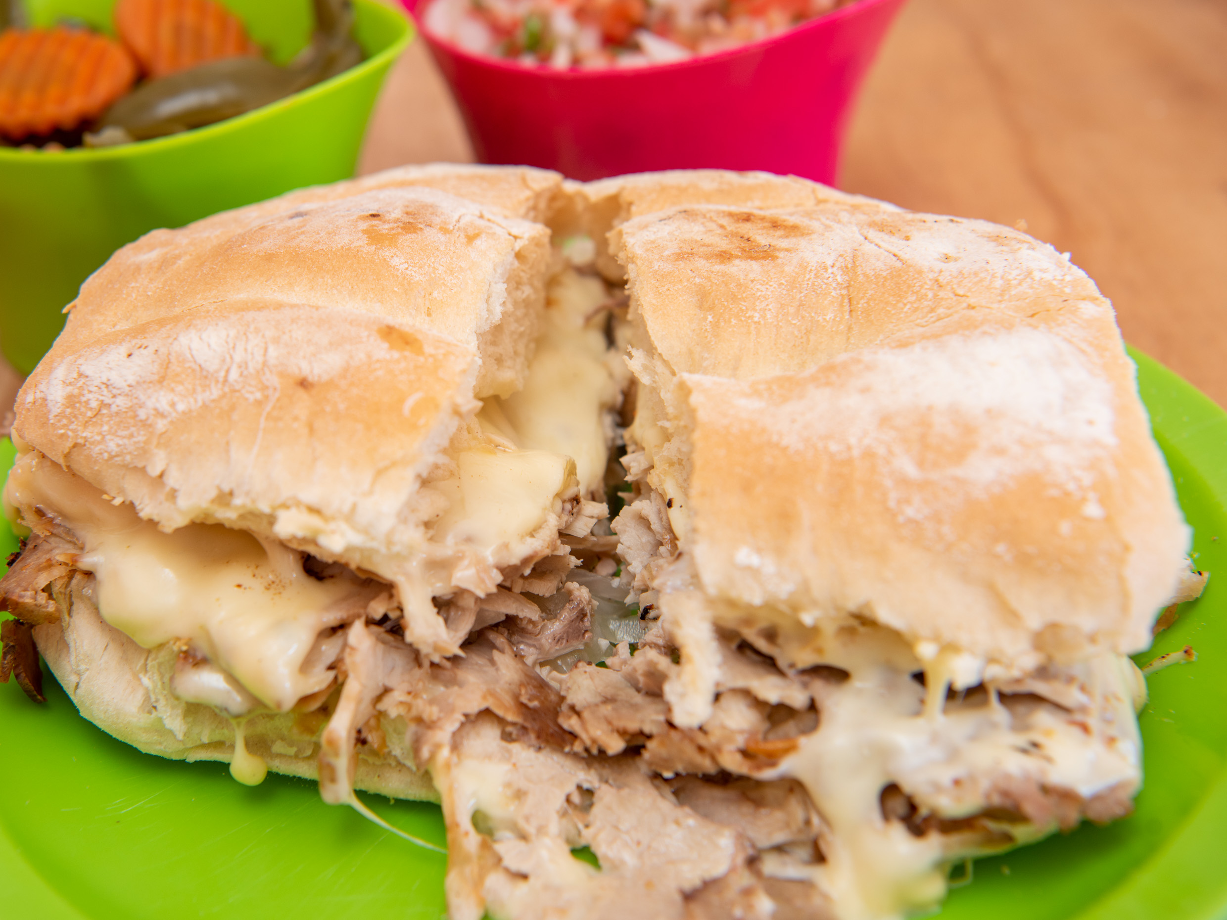 Porción para una persona, la cual incluye: pierna de cerdo rebanada (270 gramos), pan telera (30 gramos), cebolla blanca y mayonesa.
