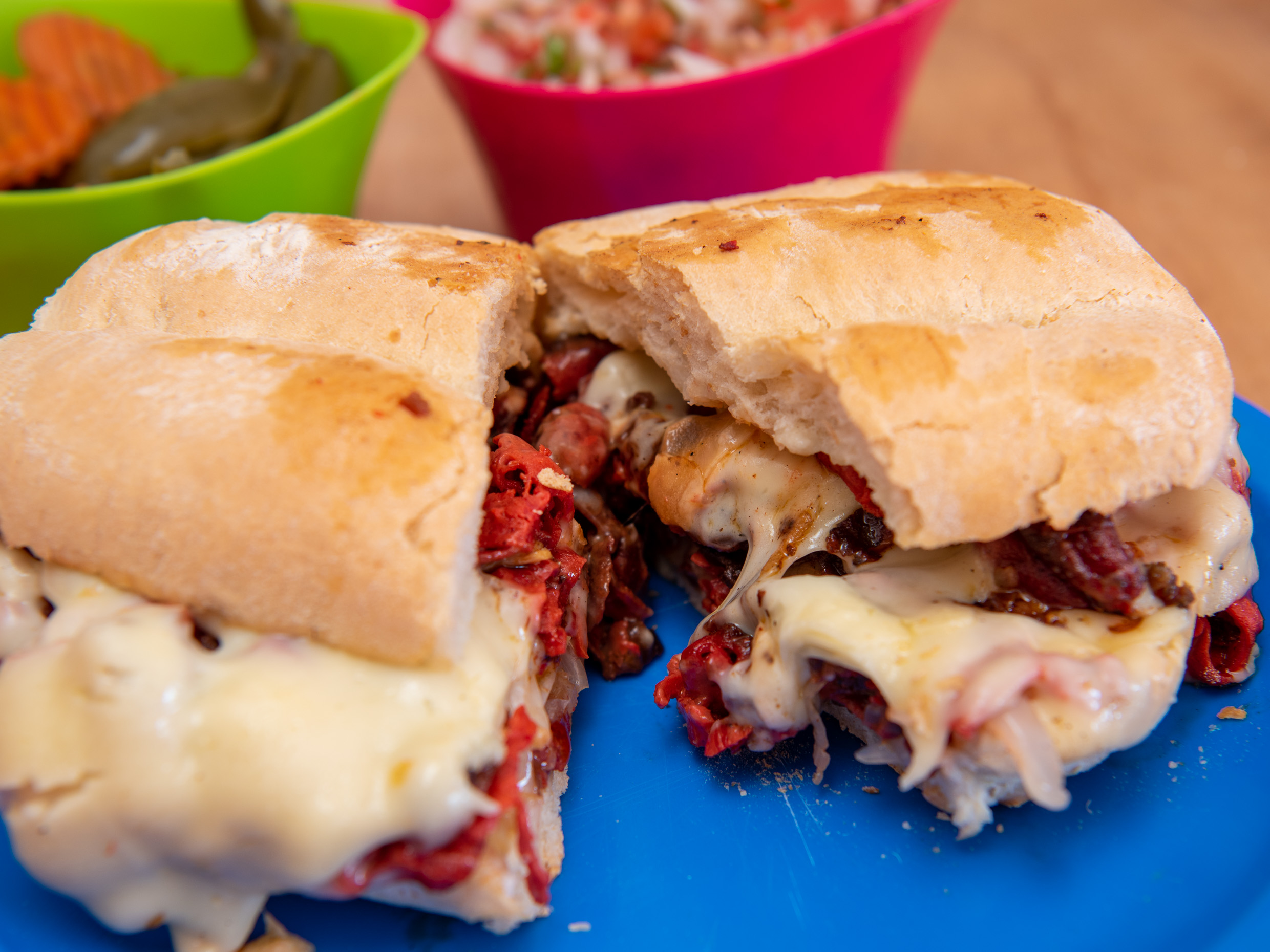 Torta de jamón de pavo, queso manchego, cebolla y mayonesa.