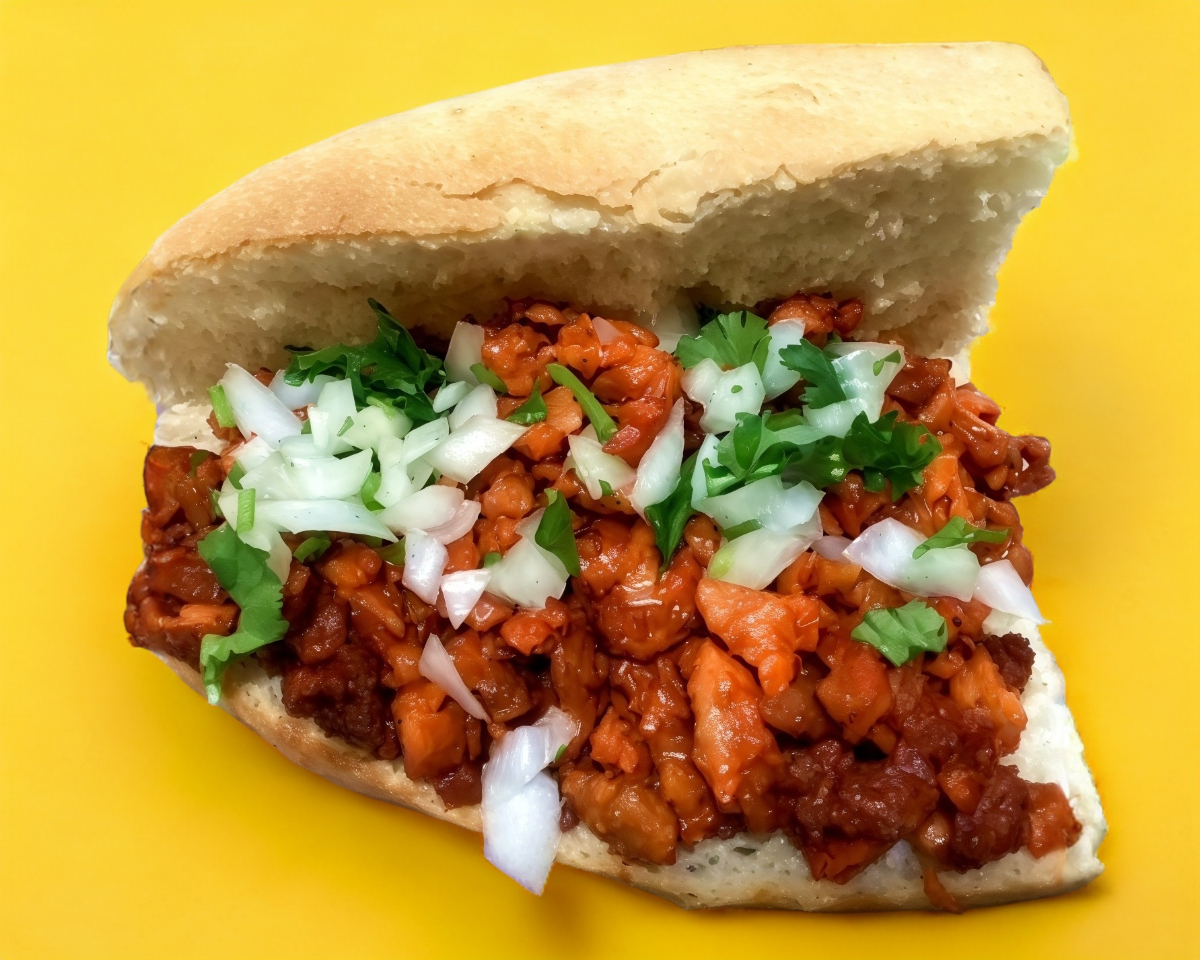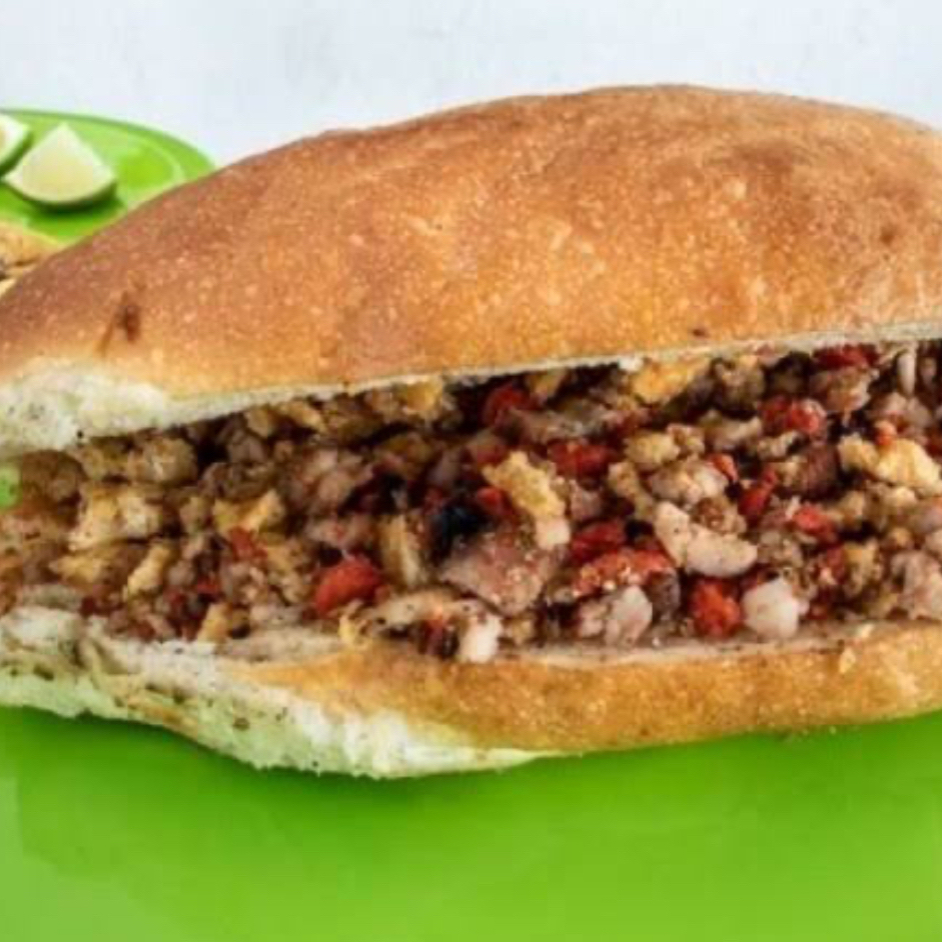 media barra de pan frances,carne al pastor,salsa verde con aguacate,pico de gallo,cebolla .