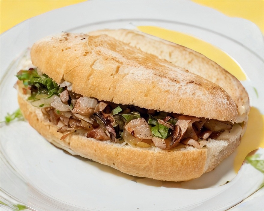 media barra de pan frances ,carne asada , cebolla asada,jamon y queso,salsa verde con aguacate y pico de gallo.