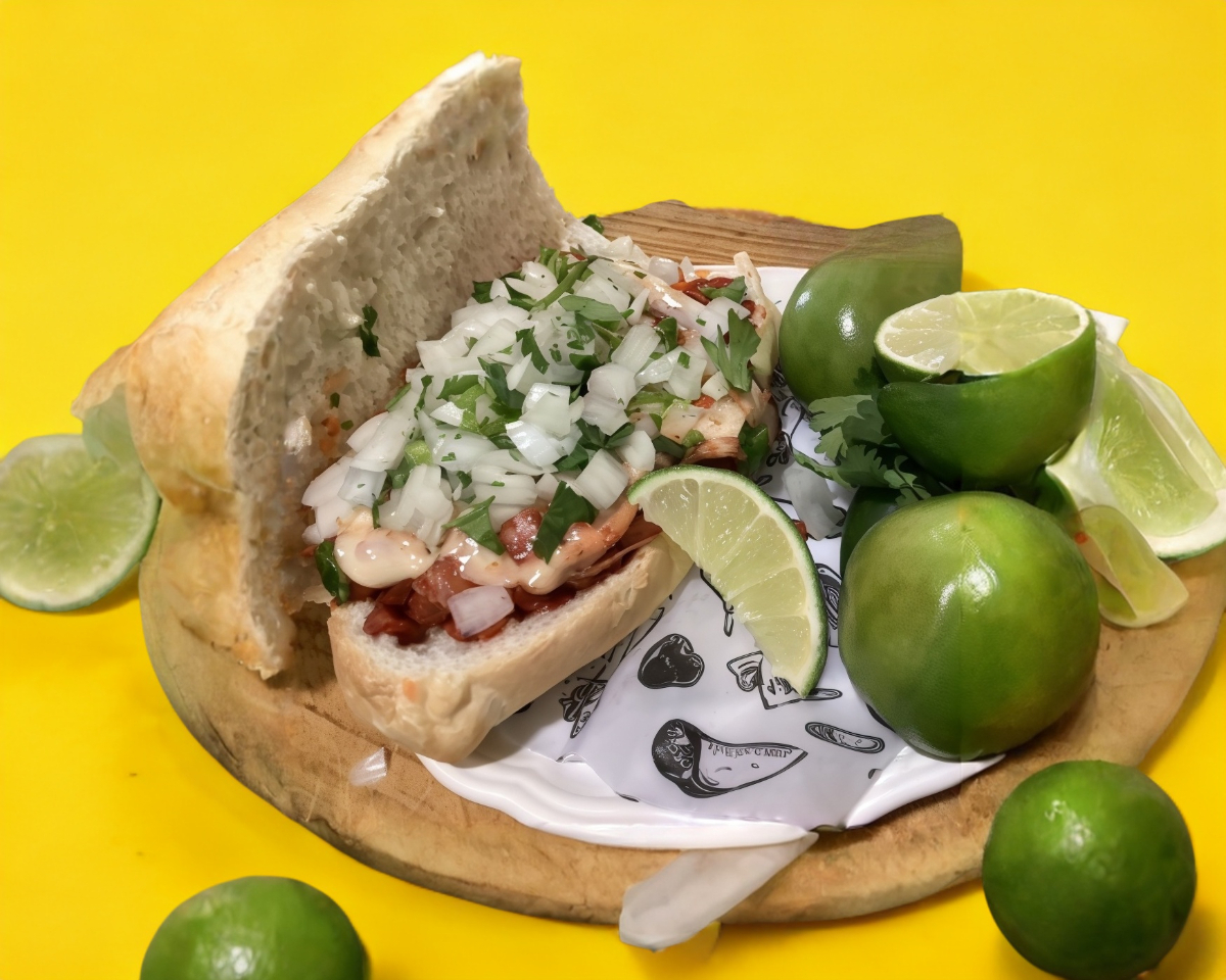 media barra de pan frances,carne asada,longaniza de valladolid,salsa verde con aguacate,cebolla asada y pico de gallo.