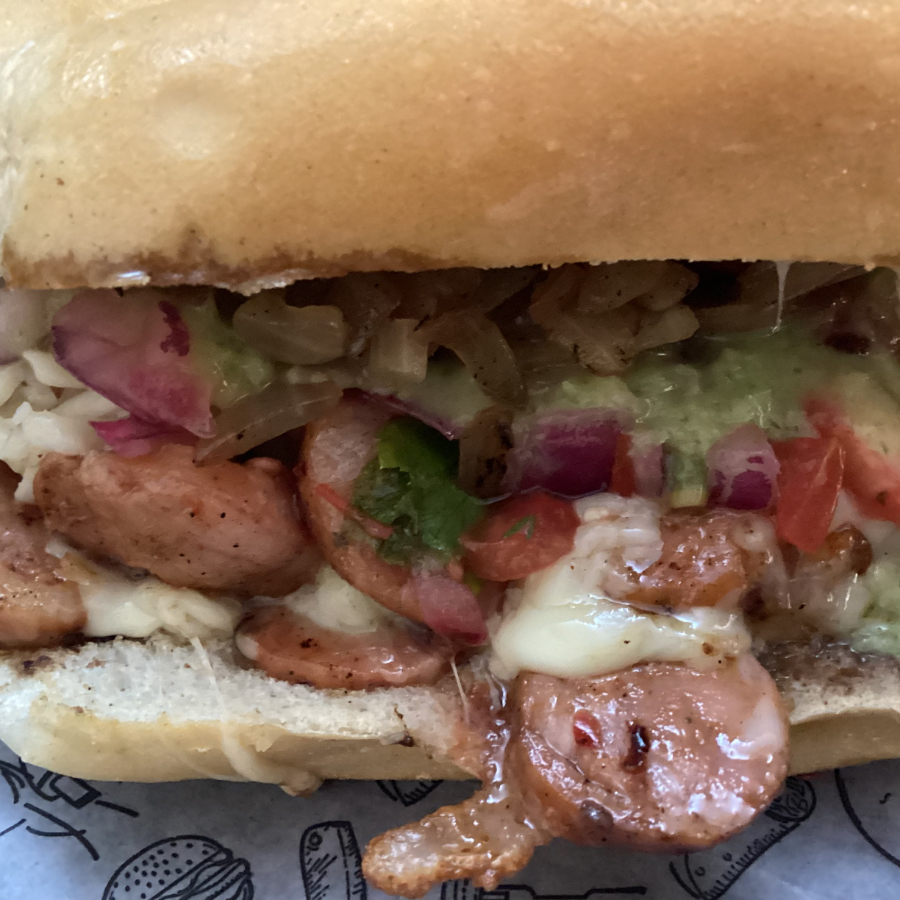 Salchicha ,jamon,queso,cebolla,catsup,aderezo.