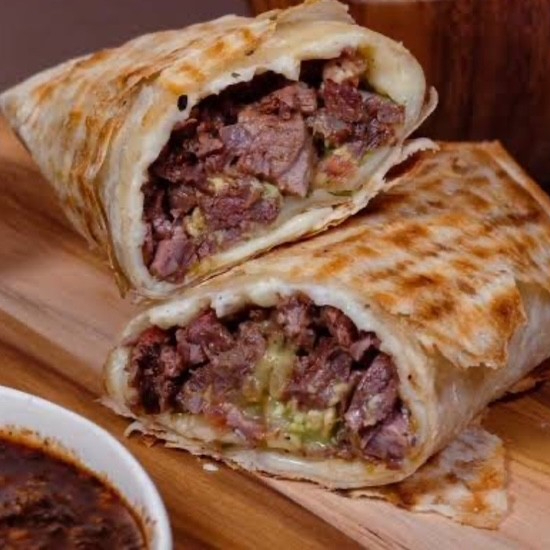 tortilla de harina recien echa,carne asada ,cebolla asada,pico de gallo,salsa verde con aguacate.