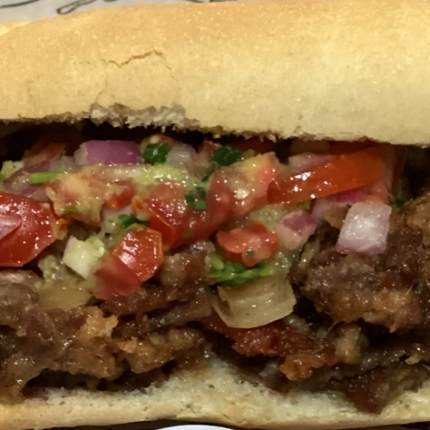 media barra de pan frances ,carne asada , cebolla asada,,salsa verde con aguacate y pico de gallo.