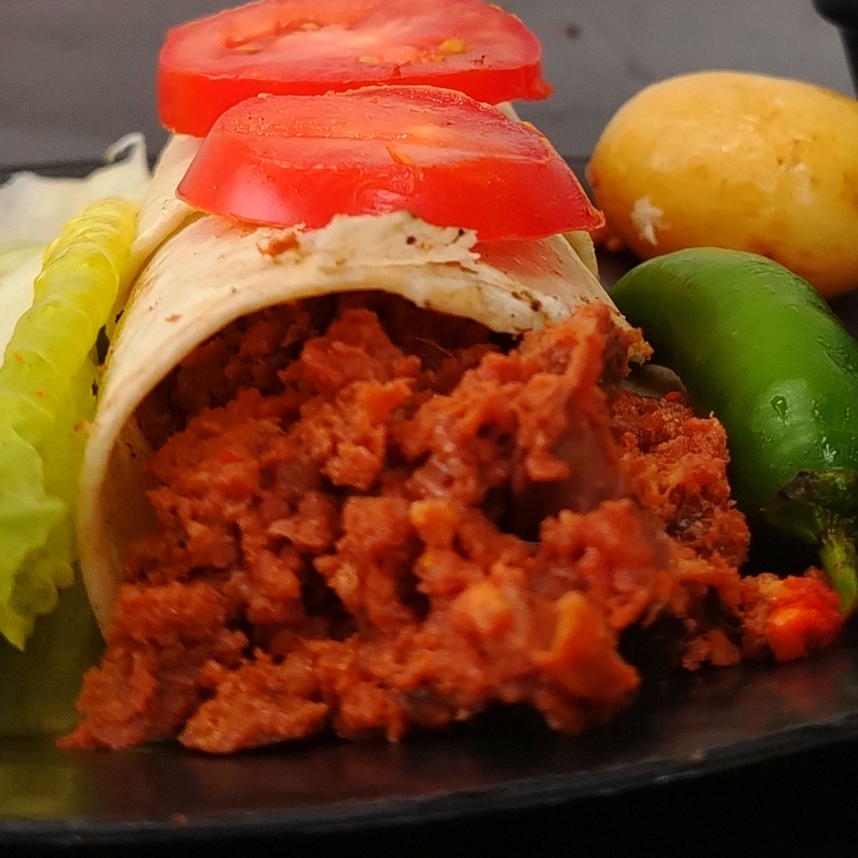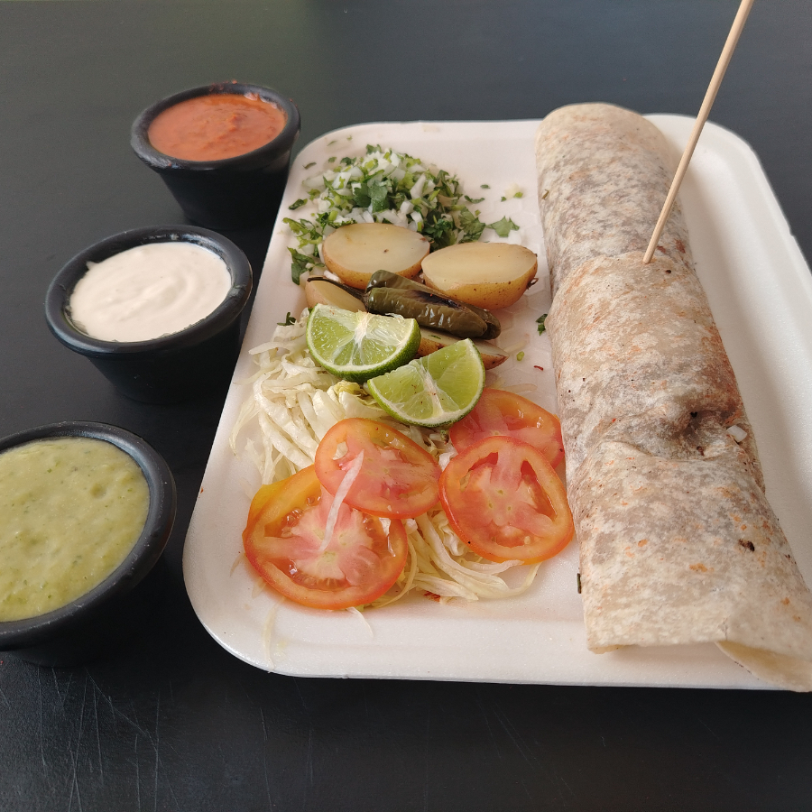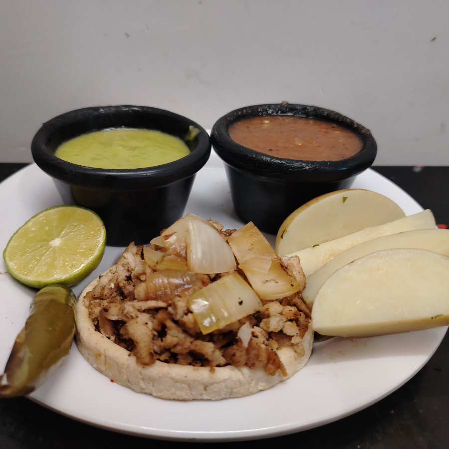 Elaborado con tortilla de harina, frijol, lechuga Italiana, jitomate, carne al pastor, cebolla, cilantro, queso rayado fundido, se acompaña con limones, salsa de guacamole, salsa Ranchera, crema xcatic, papas cambray y chile serrano.