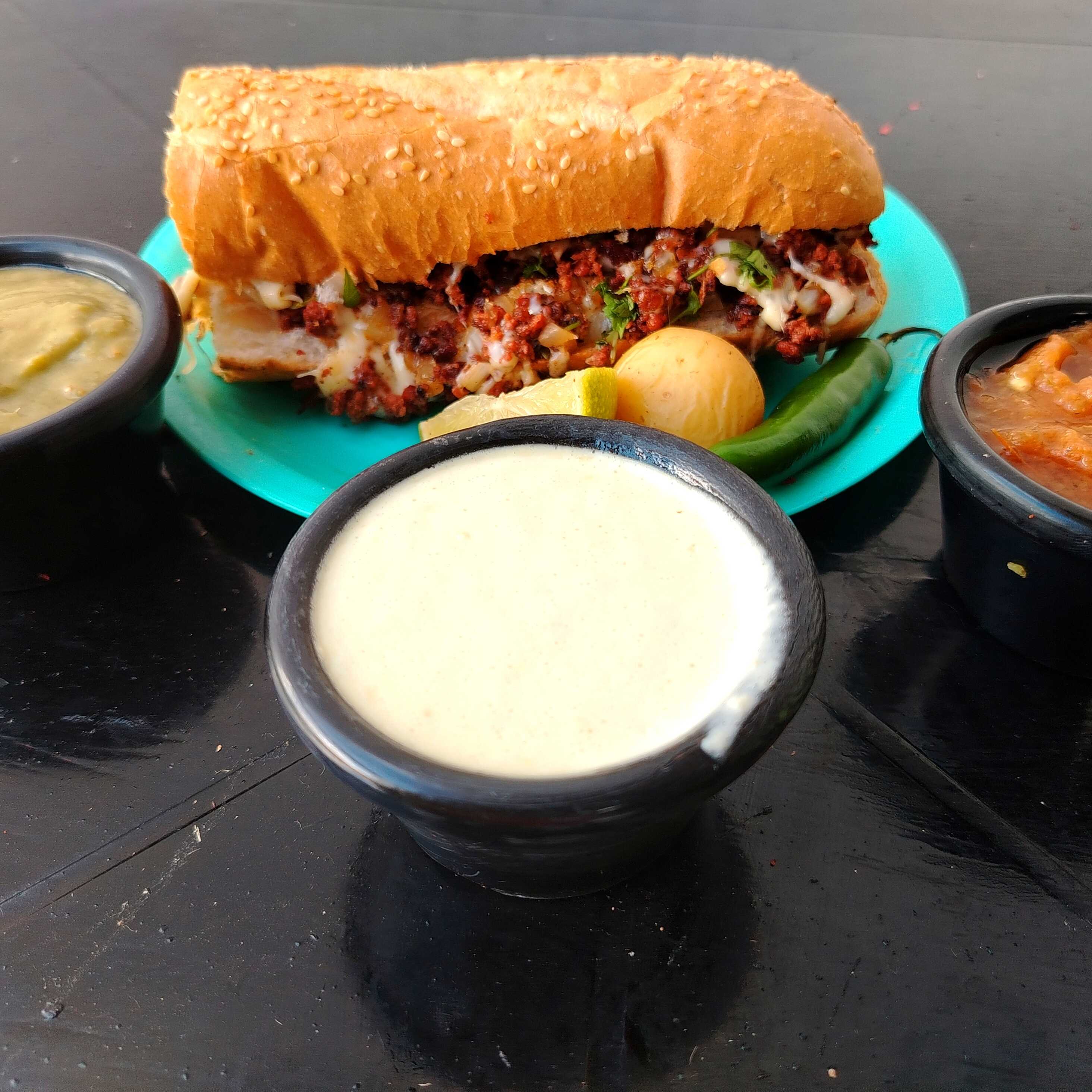 Pan Baguette con ajonjolí, capa de frijol, carne asada de cerdo, longaniza ahumada, cebolla asada, queso fundido de alta calidad, cilantro, se acompaña con papas cambray al estilo chino, chile serrano, limón, salsa de tomate, guacamole y crema xcatic.