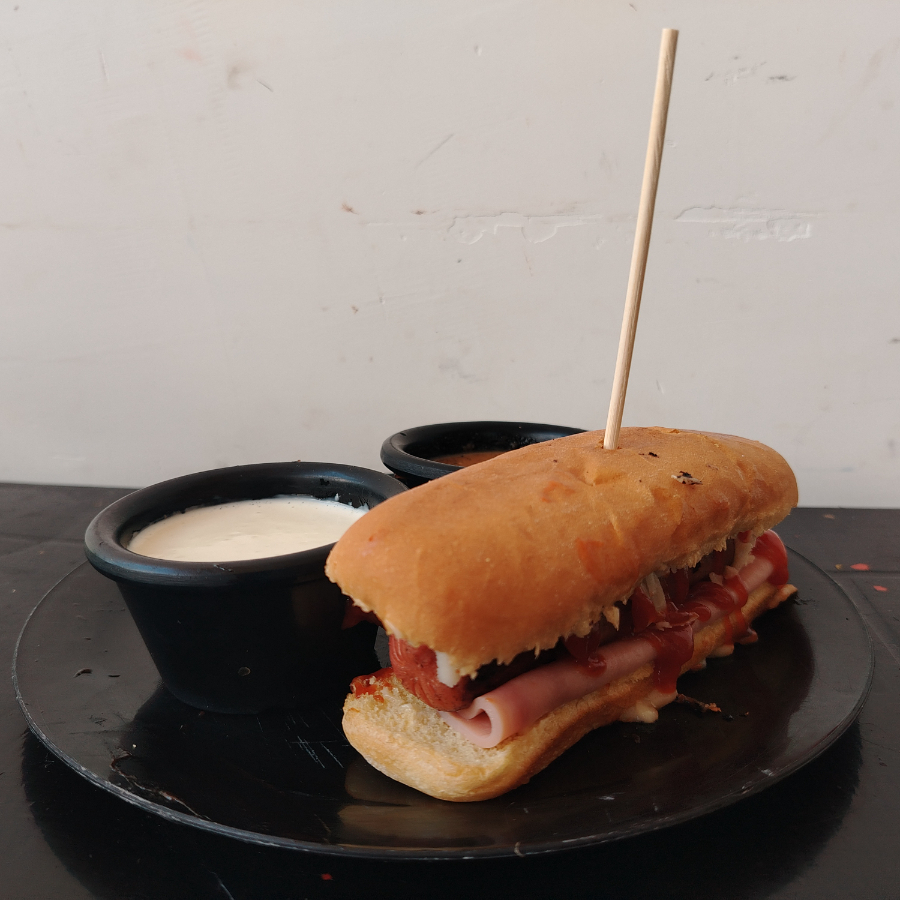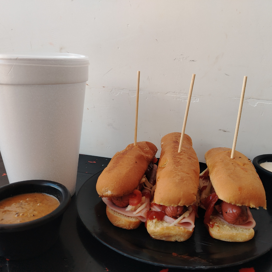 Elaborado con salchicha de pavo asada, mayonesa, catsup, pepinillos,cebolla y jitomate picado, chile serrano, salsa de crema xcatic y salsa ranchera